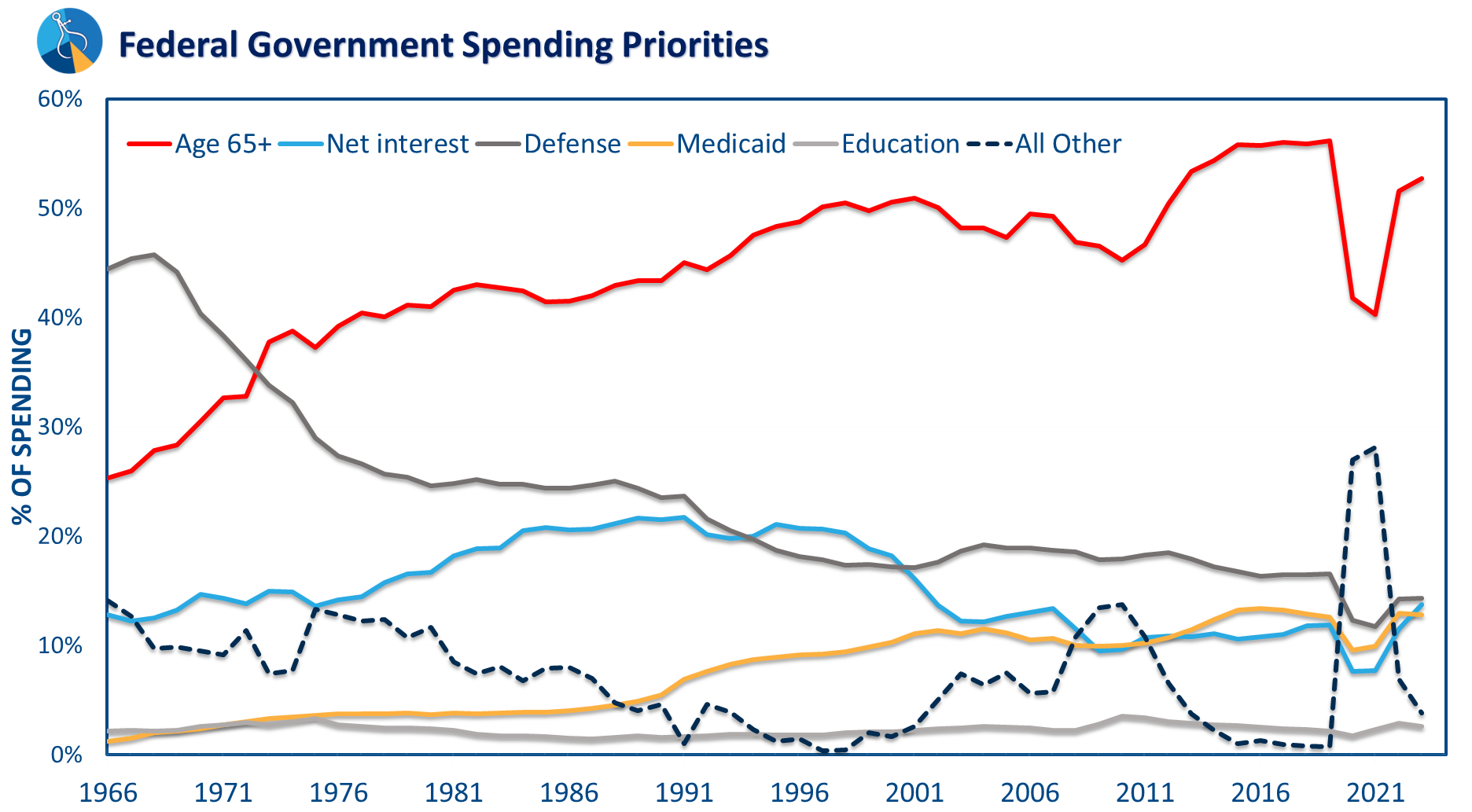 - Takeaway: The House has a slim majority to work with and did everything possible to "buy" votes to get this passed. Next up is the Senate. From a bigger picture perspective, Republicans seem to be banking on tax cuts "paying" for the spending, but we learned last time that never happened. Worse, the "conservatives" are focusing on making cuts to areas of the budget that in the whole scheme of things simply do not matter. 53% of federal spending is dedicated to retired people (Social Security, Medicare, and Federal Government Pensions.) Medicaid is 13% of spending and the Department of Education is 3%. Interest expense is about to surpass Defense spending.