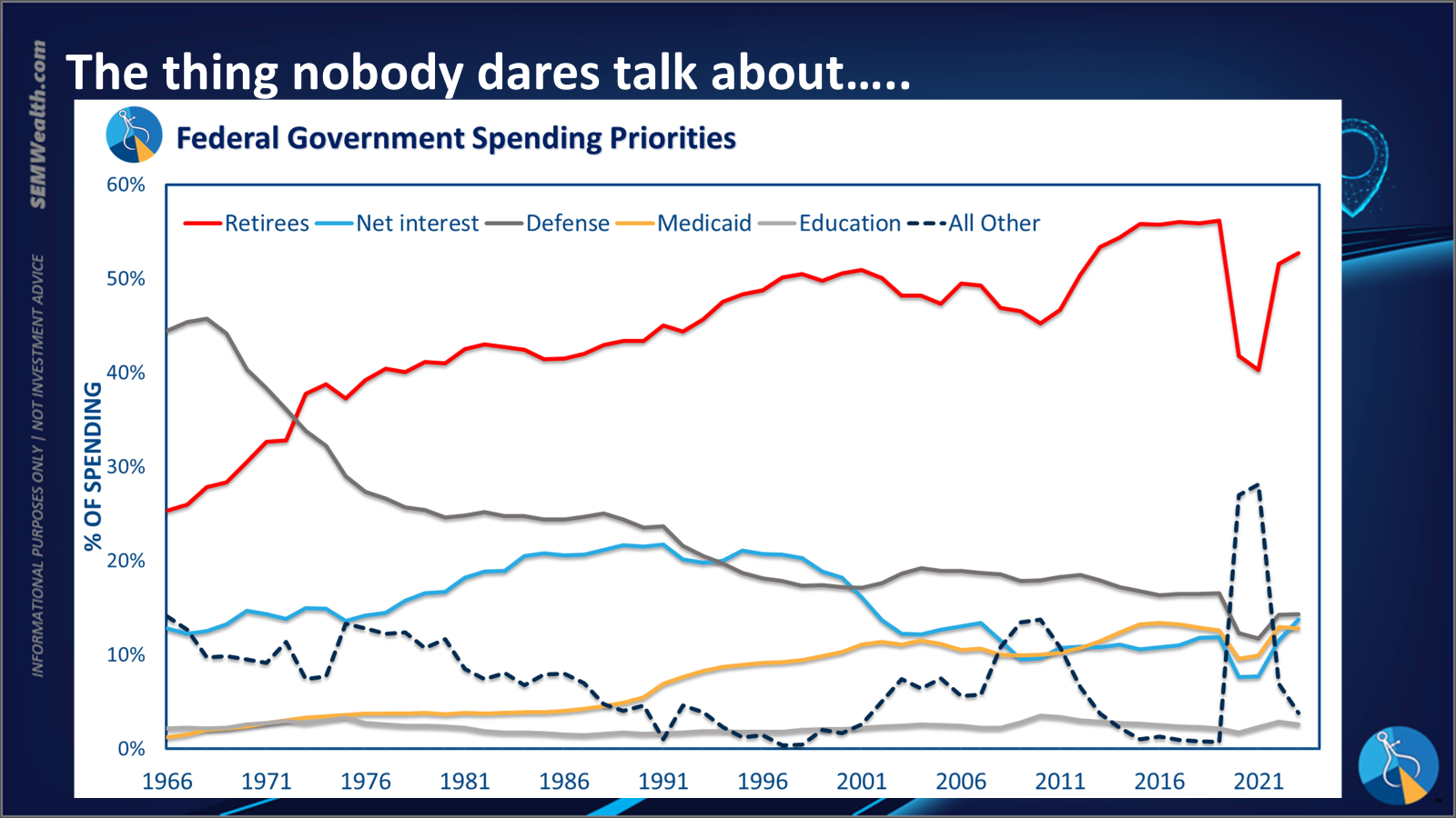 📌 Key Data Point 5: 54% of our federal budget is going to "retirees" (Social Security, Federal and Military Pensions, and Medicare). Another 19% is going to Interest, meaning only 27% of our budget can potentially be spent on things that actually GROW the economy (putting more people to work or making them more productive.)