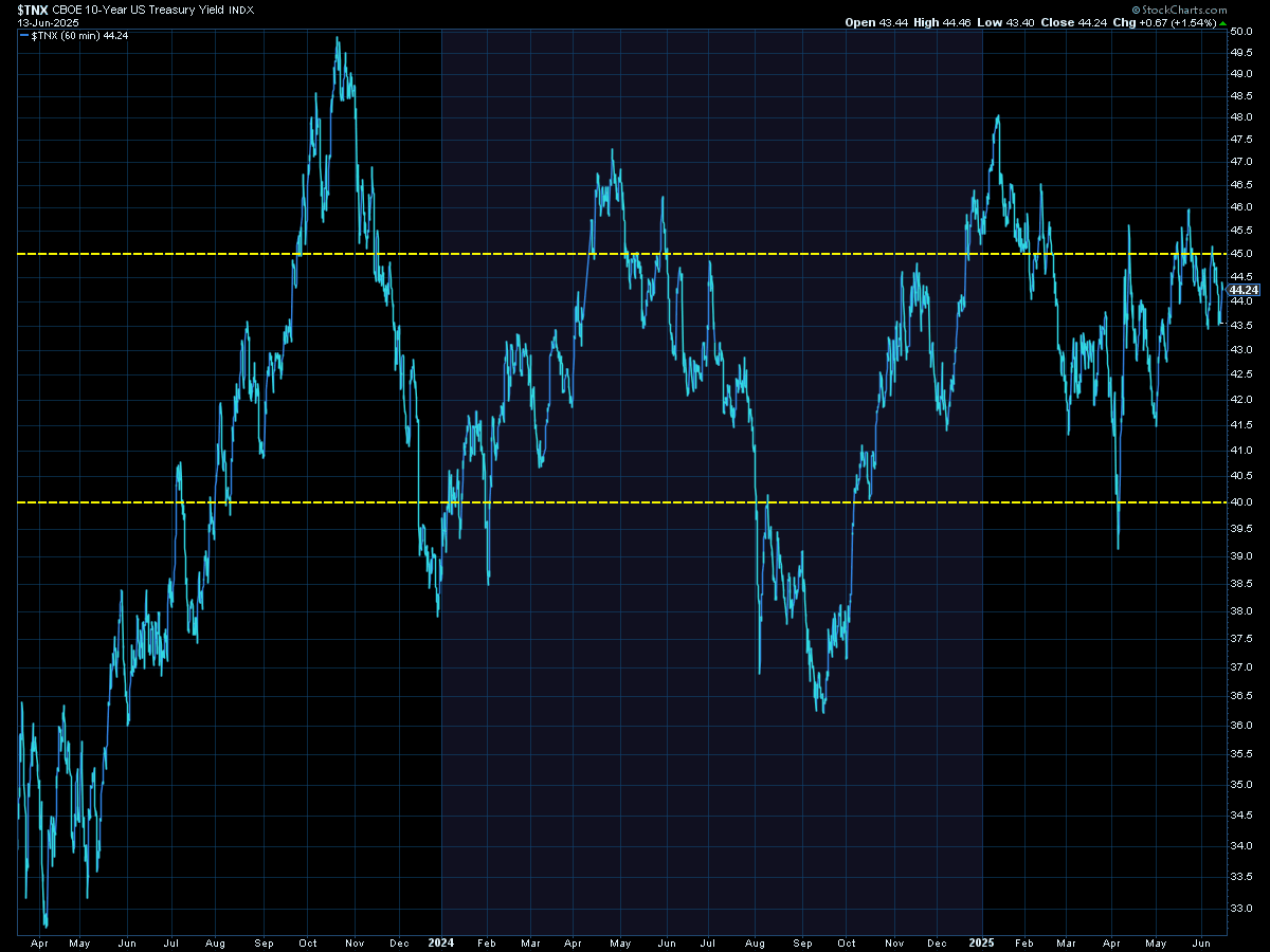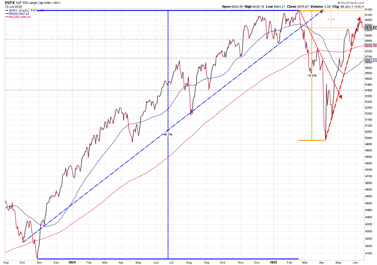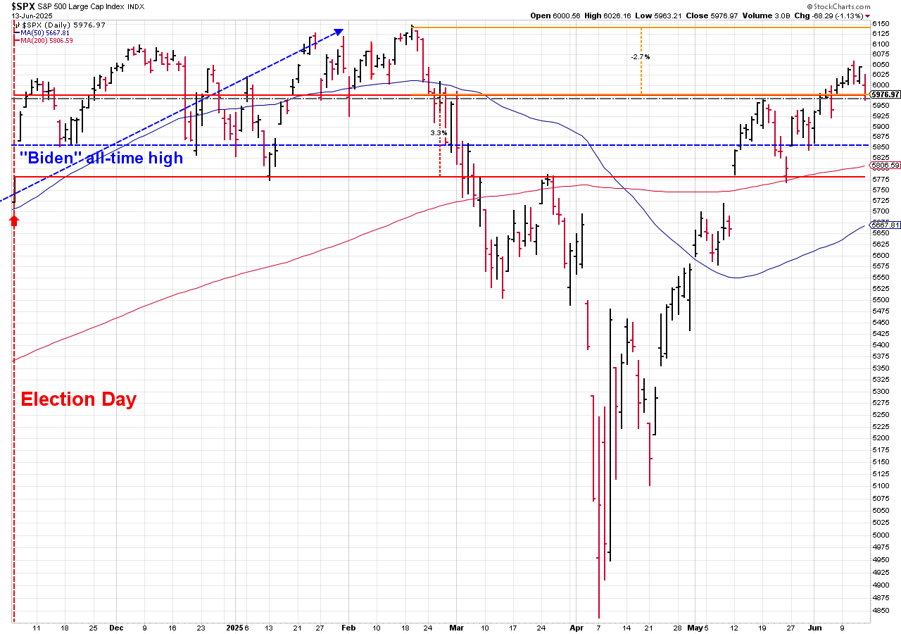 The sell-off on Friday took stocks back to the "break-out" levels. If those are able to hold, we could see a resumption of the rally, but as noted above, the market is pretty much expecting the best case scenario for stocks, so anything to disrupt it (like an escalating conflict between Iran and Israel) could lead to sharp losses.