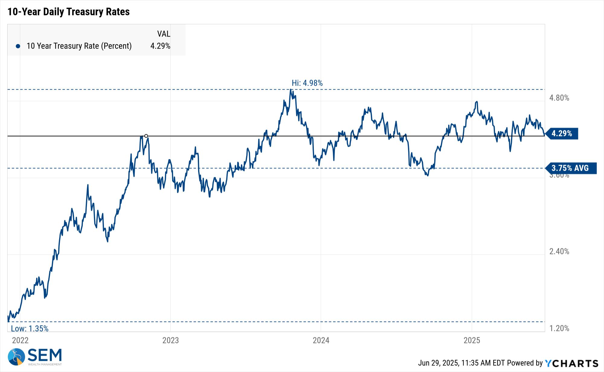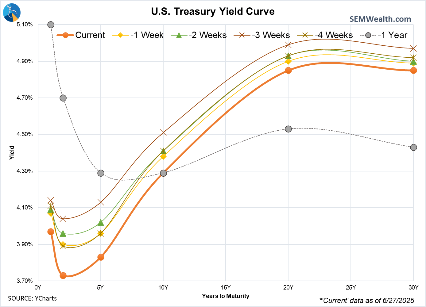 - Fed Chair Powellâs twin testimony (House Tuesday, Senate Wednesday) sounded hawkish in isolation, yet traders zeroed in on his comment that âmeaningful labor-market weakeningâ would override tariff-related inflation fears. The result: 2-year yields dropped 17 bps; 10-years fell 9 bpsâthe biggest weekly rally since early-April. The chart below highlights the gradual drop in yields the past 4 weeks.