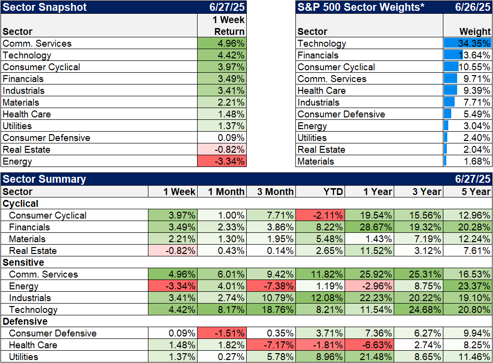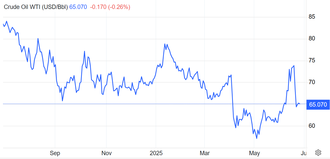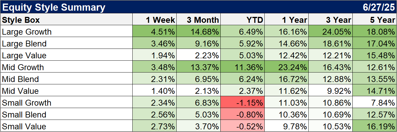 Crude oil prices dropped $10 to $63 before recovering a bit on Fridayâan 14 % peak-to-trough drop since the Iran-Israel "cease-fire". Cheaper energy fed into the âno-inflationâ narrative, but it only seemed to help large cap growth stocks as rate-sensitive real-estate and utilities both struggled last week.
