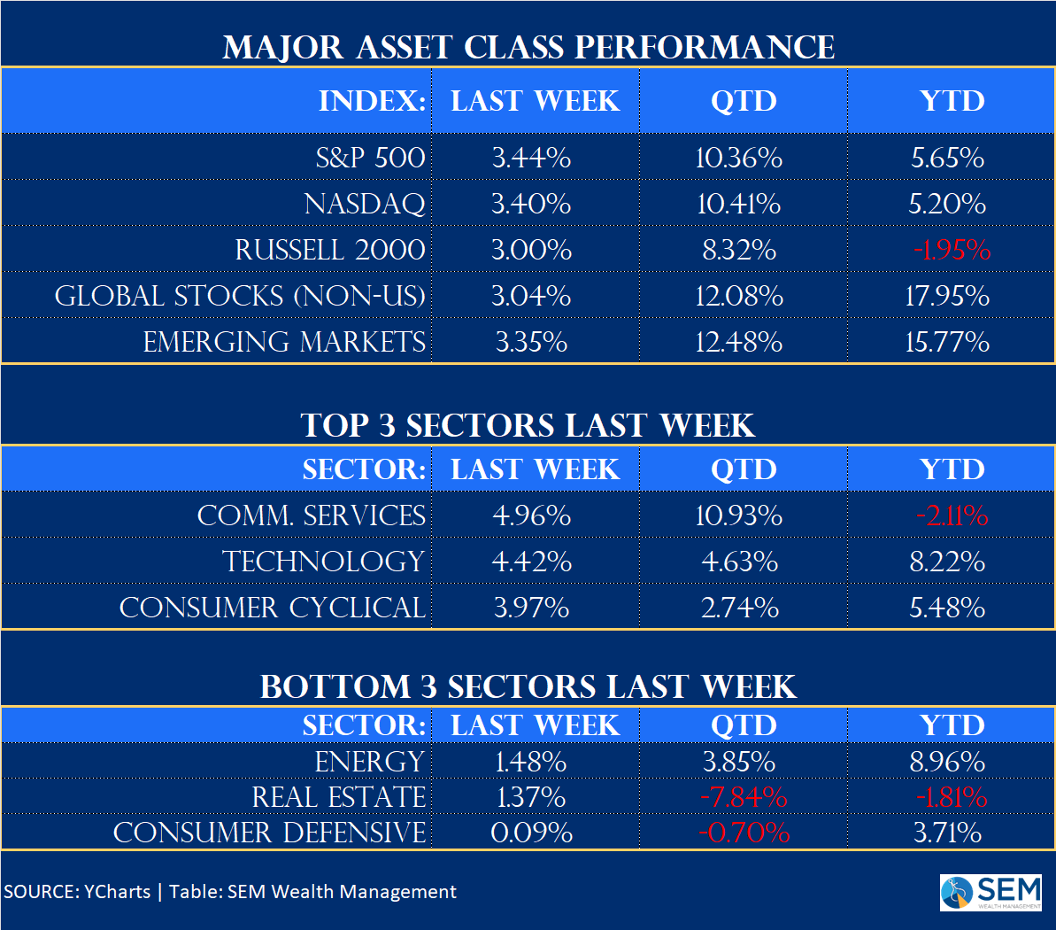 - Lower yields helped big-cap Tech reclaim leadership; Large Cap Growth gained 4.5% while Small Caps only gained 2.5%.