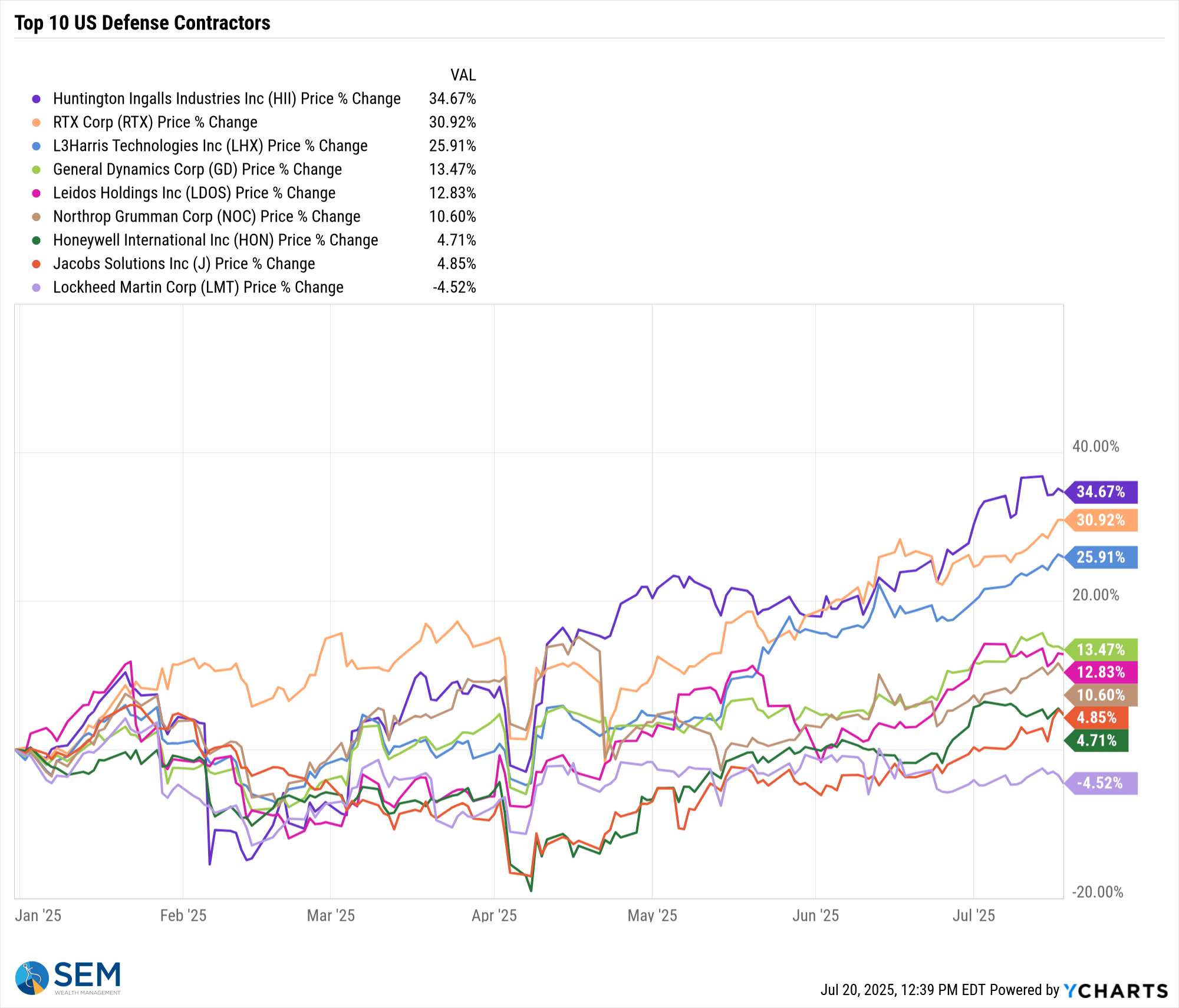 Headline: All week we saw U.S. defense contractors like Lockheed Martin, RTX, Northrop Grumman, and others in SEM’s Patriot Portfolio continue a multi-week rally. Reuters reported on Monday that President Trump announced plans to send Patriot air-defense missile systems to Ukraine, with costs to be reimbursed by the EU. This marks a significant shift toward providing heavier defensive aid amid Russia’s daily missile attacks. This followed the Pentagon announcing they were ending drone restrictions and the National Defense Authorization Act (NDAA) including $500M in Ukraine weapons aid. On Friday, the House passed the $826B Defense Appropriations bill, despite protests from some Republicans over the inclusion of foreign aid. (Sources: IBD, Investors.com, Reuters, Morningstar, New York Post).