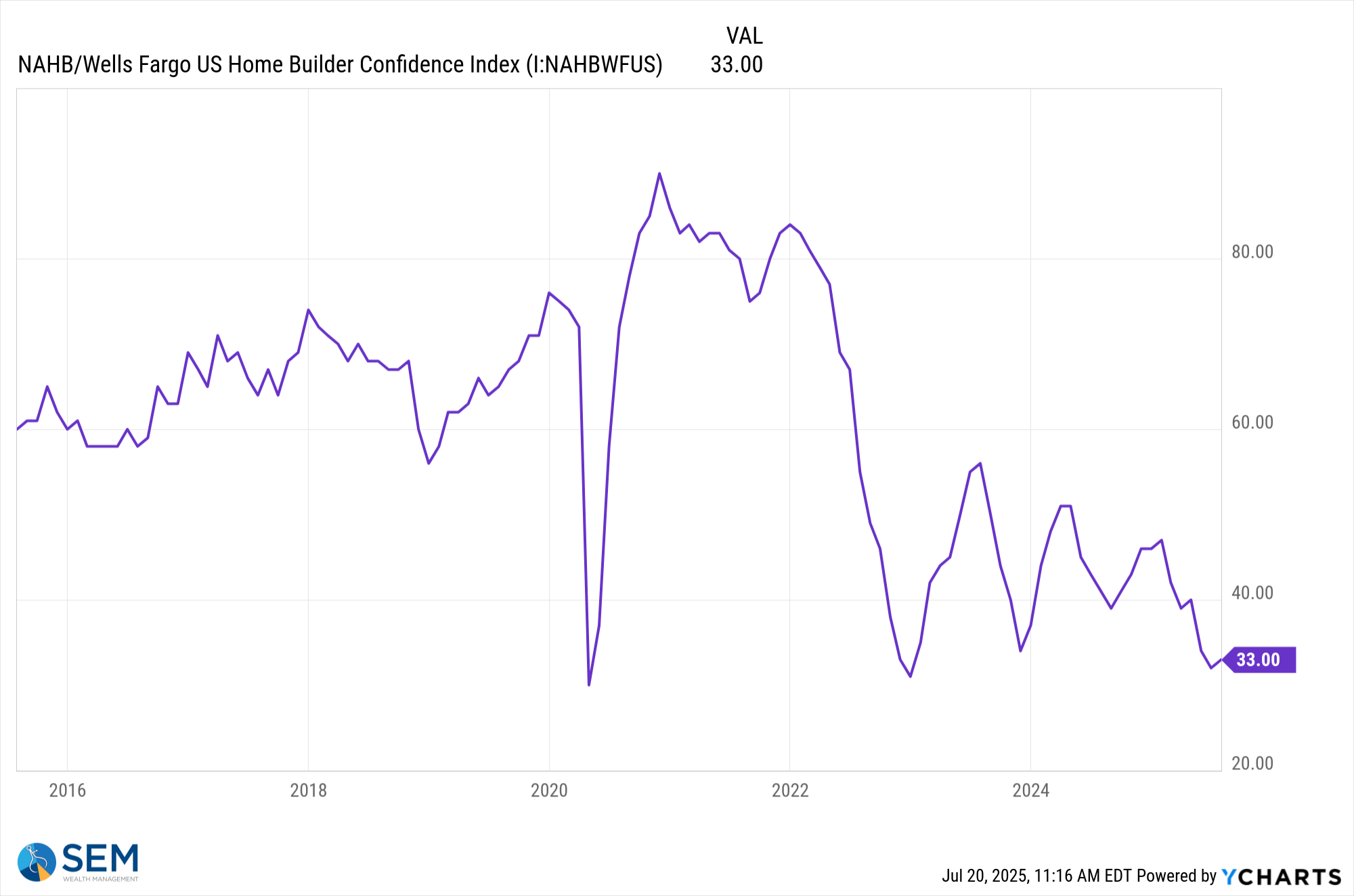 Headline: On Thursday, the NAHB reported HMI at 33, up one point from June, but still sitting near the lows of the pandemic and the summer of 2022. A more troubling sign - 38 % of builders cut prices and 62 % offered incentives (Sources: ABA Banking Journal, Advisor Perspectives, MarketWatch.