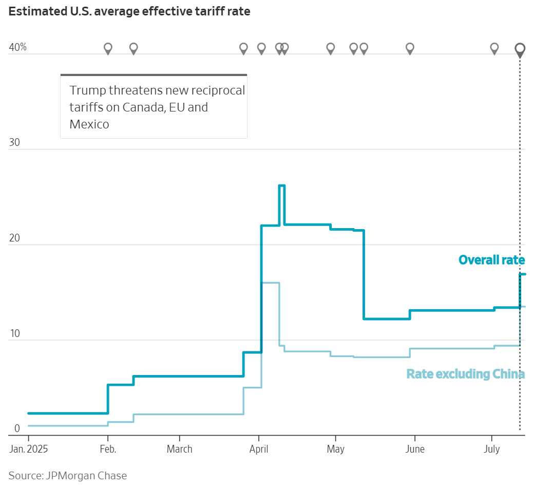 Headline: On Monday, President Trump announced plans to impose 30 % tariffs on European and Mexican imports starting August 1, with threats of deeper measures if talks falter. Markets dipped slightly but largely shrugged, with futures slipping ~0.2% as traders awaited fresh data and earnings (Sources: Reuters, Investopedia).