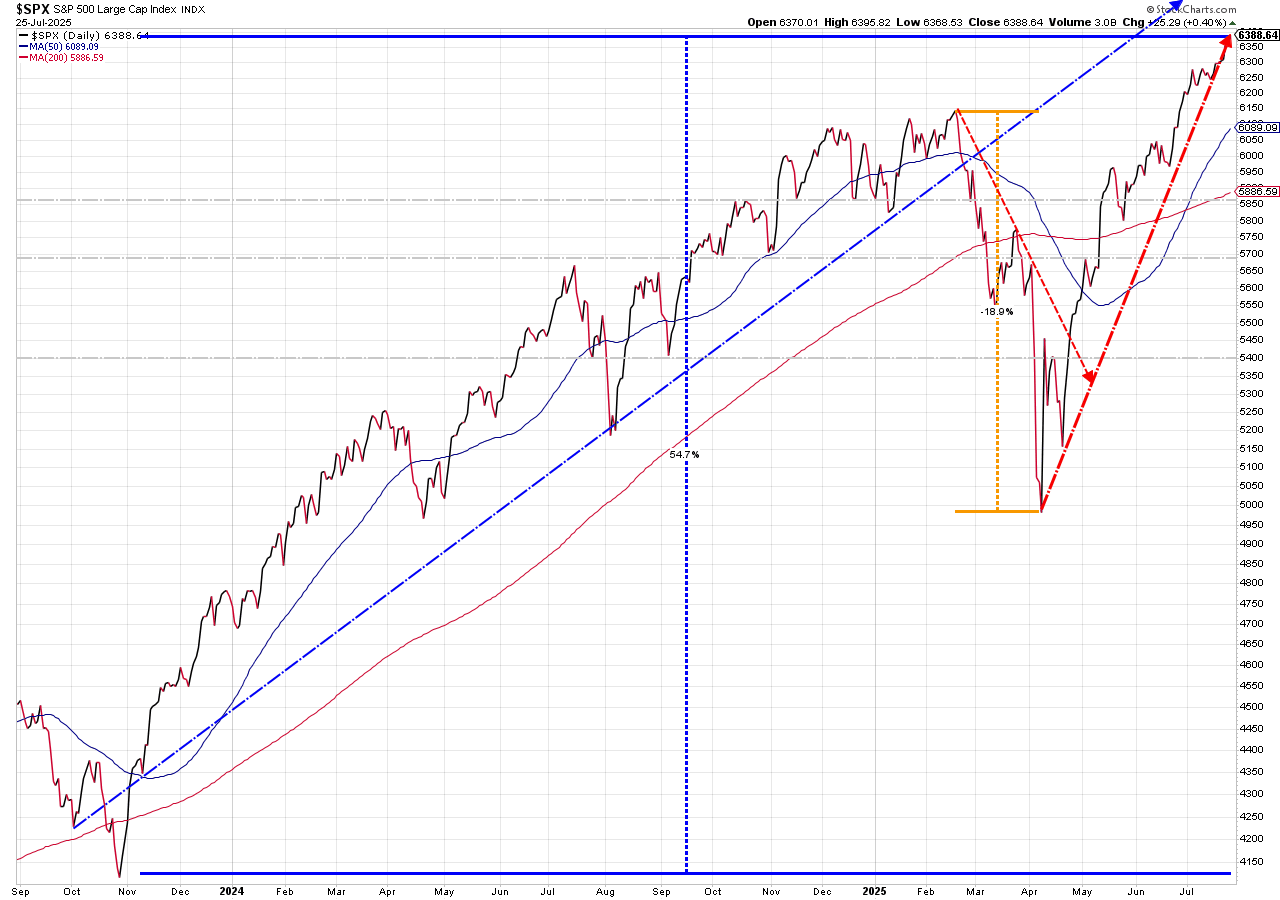 I think this chart tells the whole story. Ignoring the "liberation day" sell-off and the nearly unprecedented recovery, the stock market is surprisingly below the uptrend line that started in late 2023 when the Fed announced they were done raising interest rates (and hinted that cuts would be coming). At the rate we've been going the market will catch that uptrend line in 2-3 weeks.