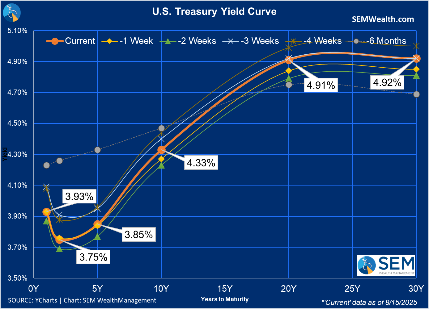 This led to interest rates picking up a bit, but not as much as you would have predicted if I told you how much Producer Prices jumped last month. The yield curve is still implying problems ahead for the economy, but the stock market believes these "problems" will be reason to celebrate because it will lead to the Fed easing interest rates. The market appears to have shifted from pricing in a 50bp rate cut, but most Fed Watch indicators are predicting a 90%+ chance of a 25 basis point cut in September.