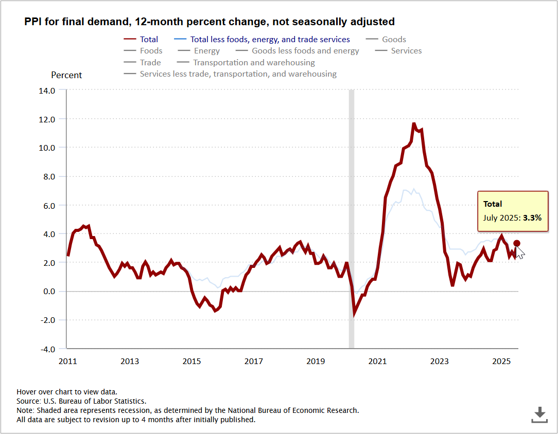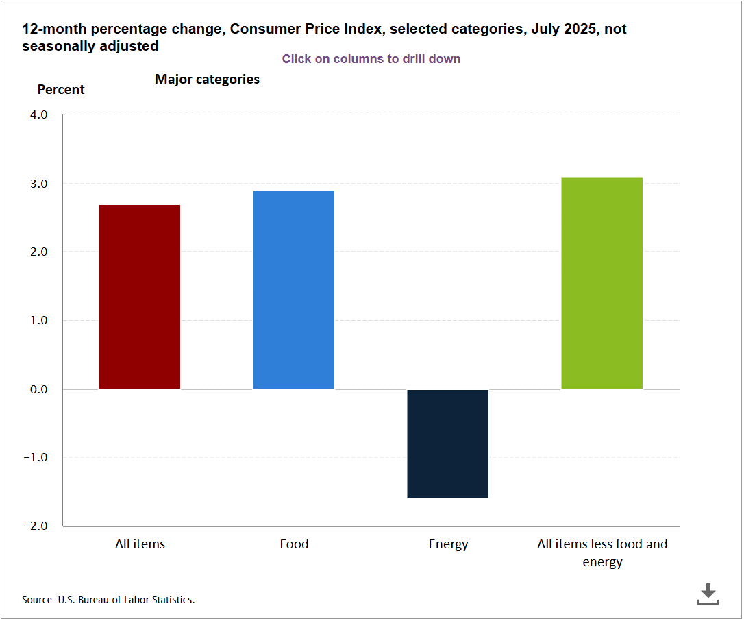 Now that we have some clarity (and inventories have been burned off) we are see the impact of tariffs on inflation begin to hit. In July Consumer Prices again moved higher, crossing the 3% level again over the past 12 months. The only positive this summer has been a drop in energy prices. Everything else is rising much faster than the Fed's 2% target level.