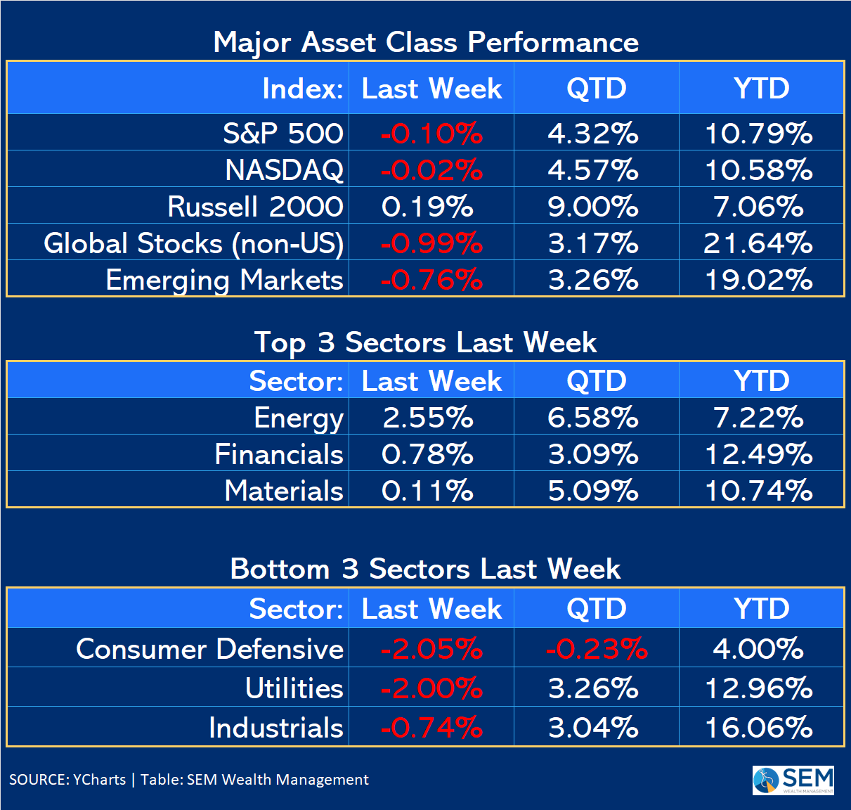Even after Friday's increase in rates, we saw yields drop nicely across the board last week. The short-term inversion in rates between 3 month and 5 years remains a cause for concern for both the economy and normal financial market functions.
