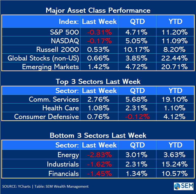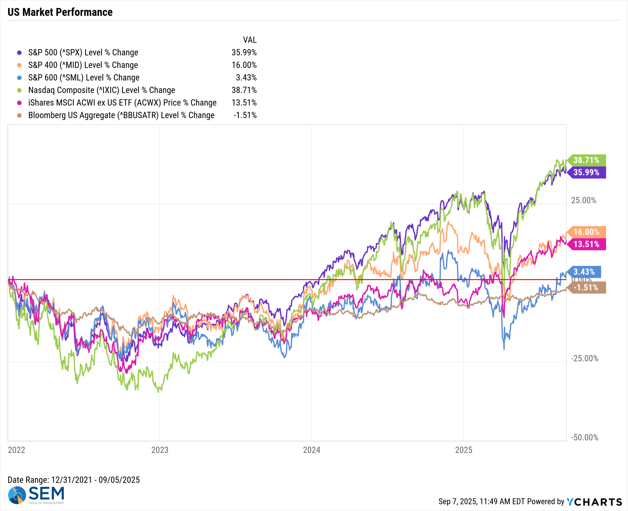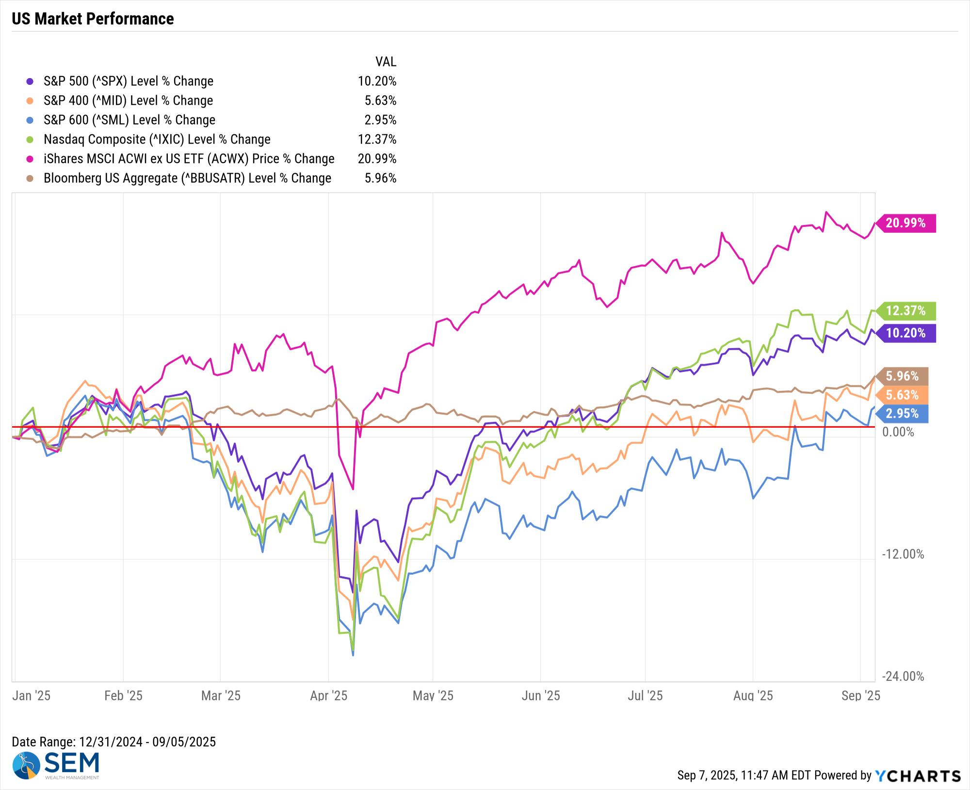 Looking at broader indices, we can see a wide range of returns, with small and mid-caps continuing to lag the mega cap stocks.