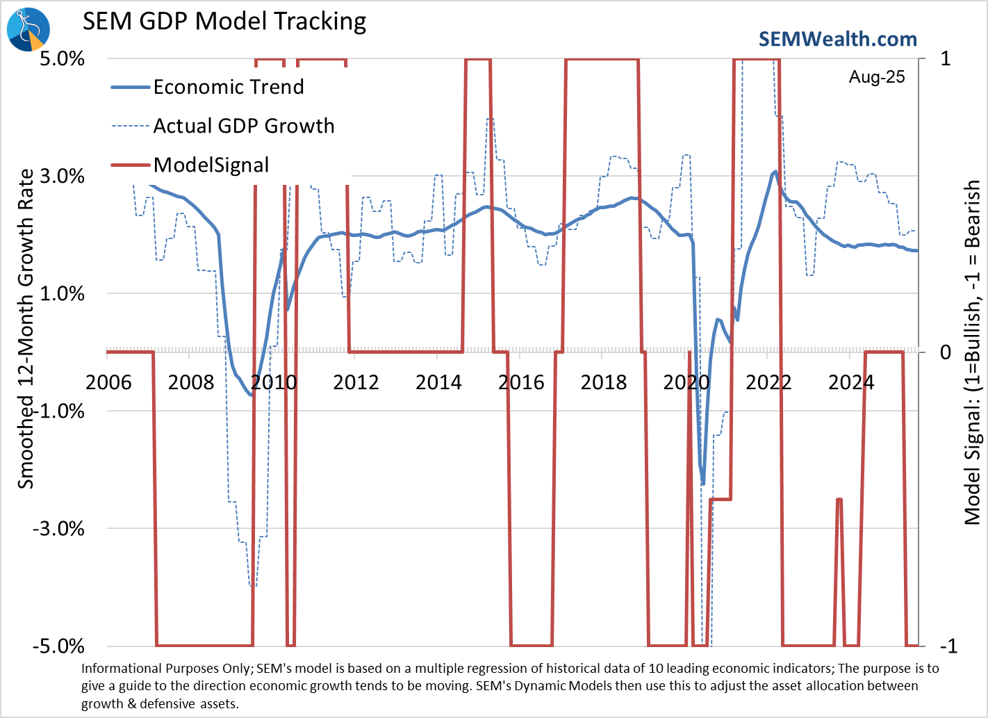 Dynamic (monthly): The economic model went 'bearish' in June 2025 after being 'neutral' for 11 months. This means eliminating risky assets – sell the 20% dividend stocks in Dynamic Income and the 20% small cap stocks in Dynamic Aggressive Growth. The interest rate model is 'bullish' meaning higher duration (Treasury Bond) investments for the bulk of the bonds.