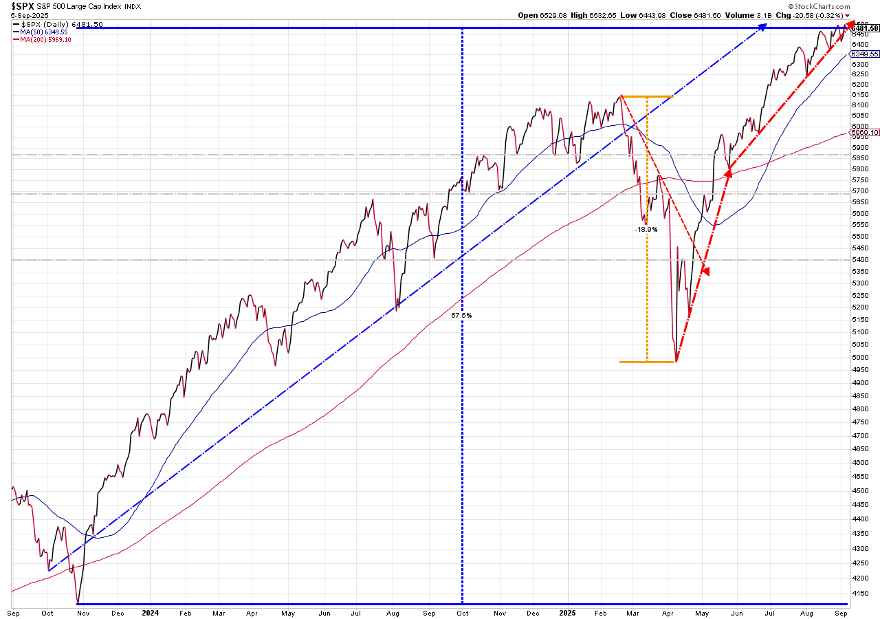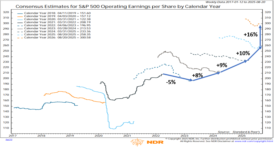 I was curious what the current earnings estimates were for the S&P 500 given the weakening economic data. Analysts have dropped their 2025 estimated growth from 16% at the beginning of the year down to 10%. That hasn't hurt stocks because they believe the earnings growth they thought would occur in 2025 is now simply going to occur in 2026.