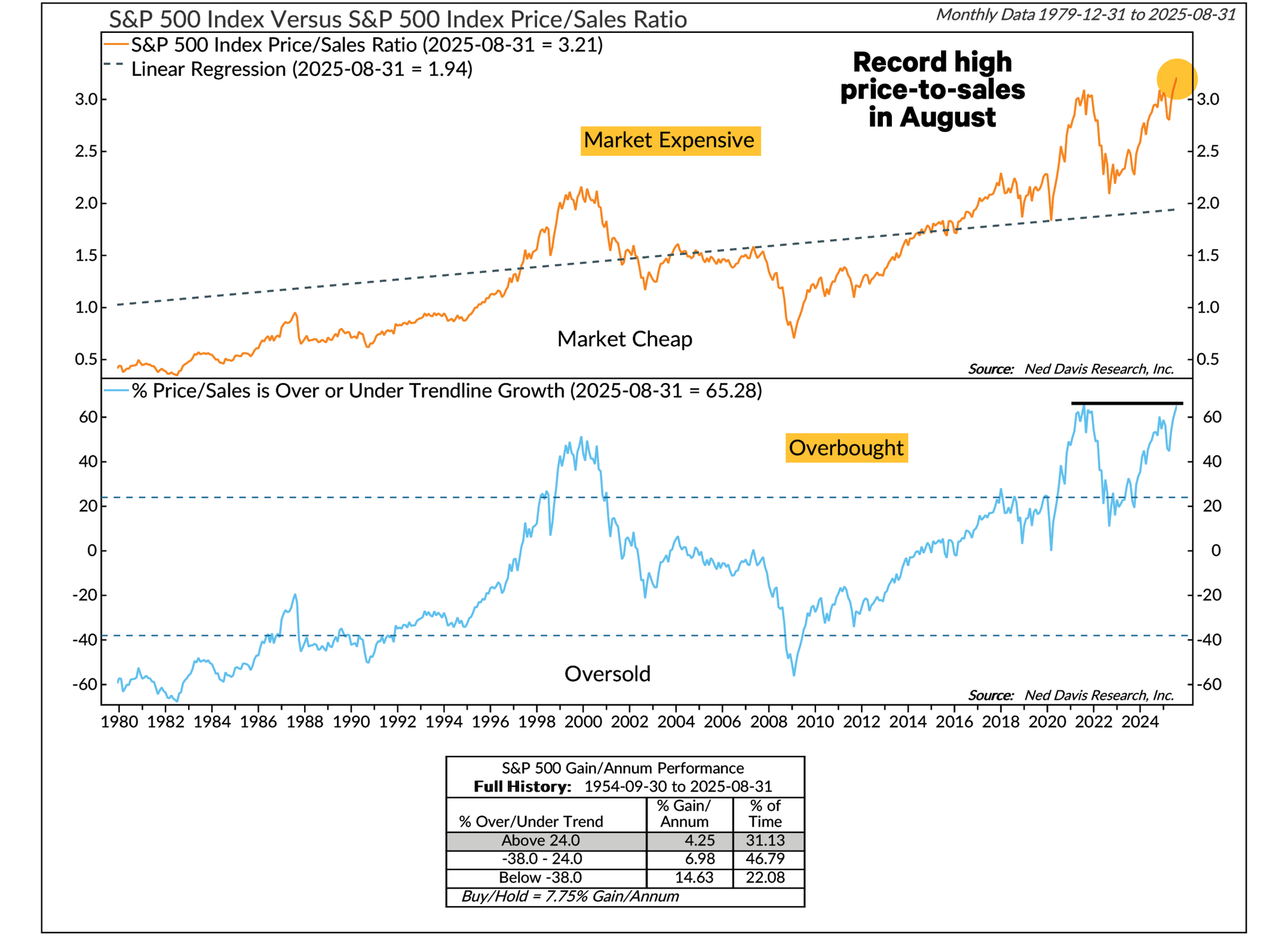 As an accountant, I like the Price/Sales ratio much more than the much more popular Price/Earnings ratio. This is because it is quite easy to make your earnings look better by using a wide range of accounting tricks. This allows companies to "beat" earnings estimates most of the time and post decent enough earnings growth to keep the market happy. It is much harder to manipulate revenue (although companies will try). The Price/Sales is at a level where NDR says we should expect gains around 4% for stocks.