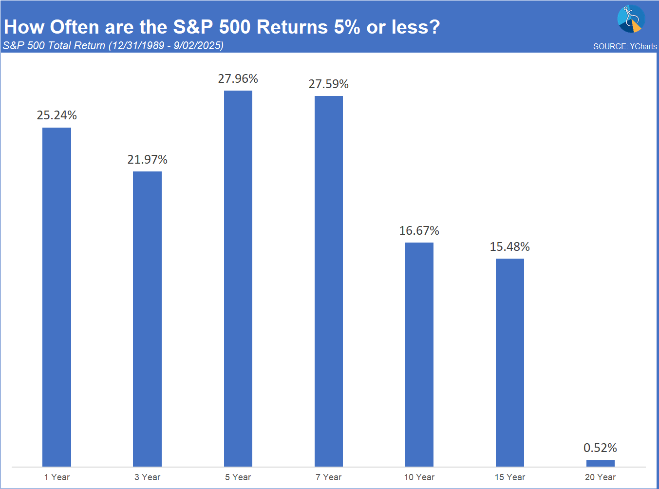 Since 1989, the 10-year average return has been negative 7% of the time. It has been less than 5% over rolling 5-year periods nearly 28% of the time. In other words around 1/4 of the time you should expect returns that are less than half the long-term average.
