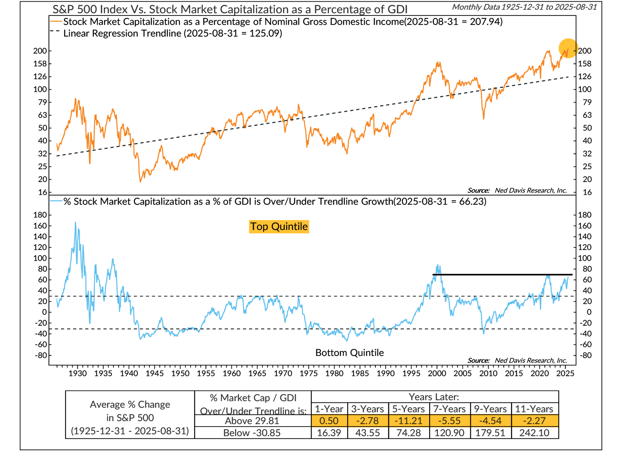 Another measure which cannot be manipulated is the market capitalization as a percentage of Gross Domestic Income (GDI). This is a similar concept to the famous "Buffett Indicator" which measures Market Capitalization to Gross Domestic Product (GDP). NDR uses GDI because it is more stable and subject to less revisions. It represents all income produced in the US. Regardless of which indicator is used, the concept is economically sound: The stock market is a measure of EXPECTED growth versus the current level of output/income. Since all economies go through recessions, a stock market cannot ALWAYS be worth more than the underlying economy, so the market will go through a correction.