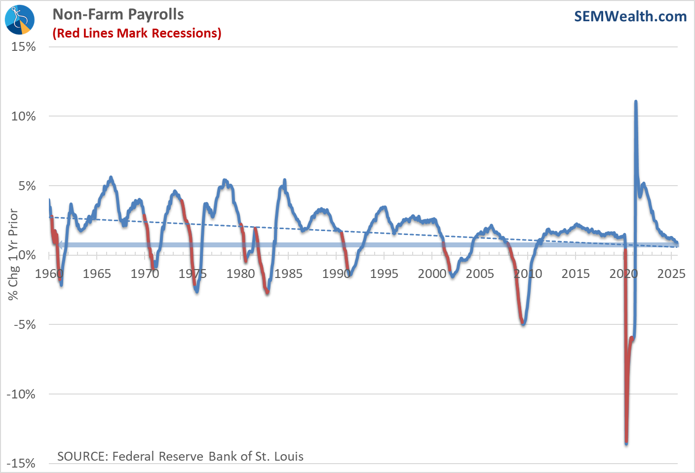 Regardless, the messaging from the data has not changed. The labor market is at stall speed. One thing I love about the FRED (Federal Reserve Economic Database) Excel plugin is whenever data is revised, it will automatically update the data in our economic model. Prior to 2001 I used to have to rekey in the data. Here is the updated payrolls chart. Note that historically whenever we'd been below a 1% annual increase in jobs we were either already in a recession, or heading that way.