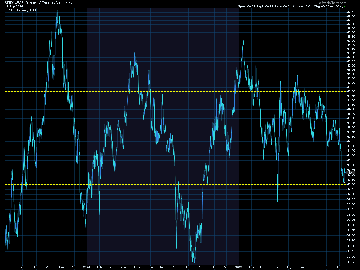 Bonds will tell the more interesting story this week. I've been showing the 20 year chart of bond yields. Here's a shorter look. A move below 4% could see long-term yields moving down to the 3.6% range we hit a year ago.
