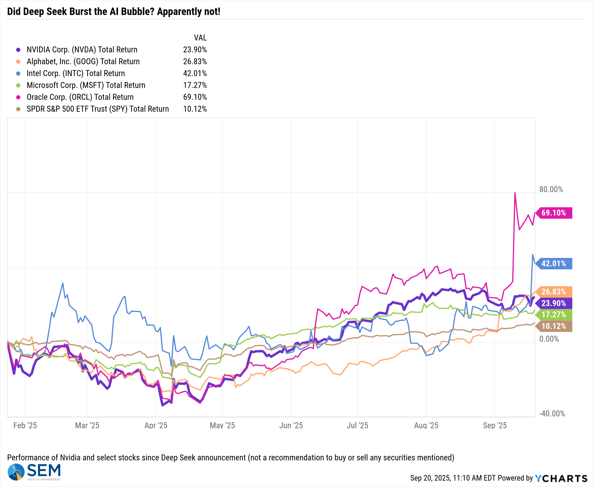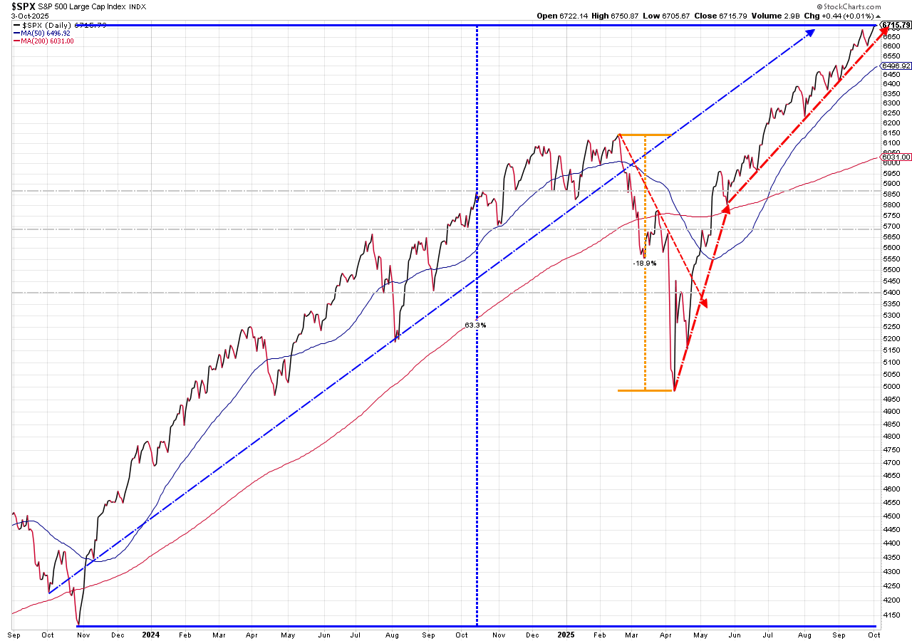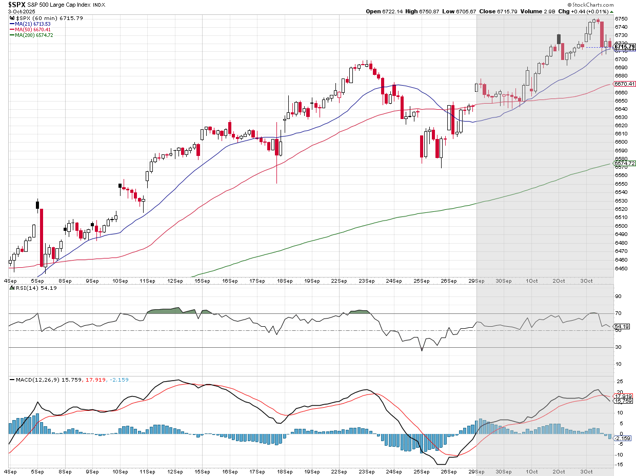 Shutdown, what shutdown? As noted at the top, the market generally does not care when the government shutsdown. The Fed is easing, AI spending is thought to be in the early days, and nothing can stop the market (or at least that's what you would be lured into believing by looking at the year so far.)