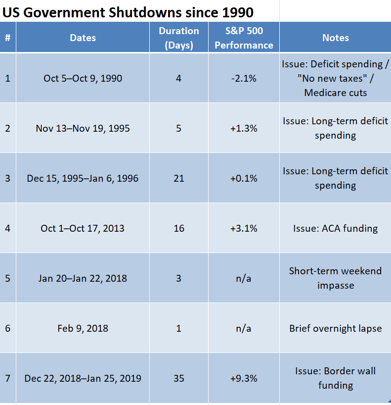 For everyone else, this may be an annoyance, but it isn't really a big deal in terms of stock market or economic impact. This is just the 7th time since 1990 the government has shut down. The last time was in late 2018/early 2019.
