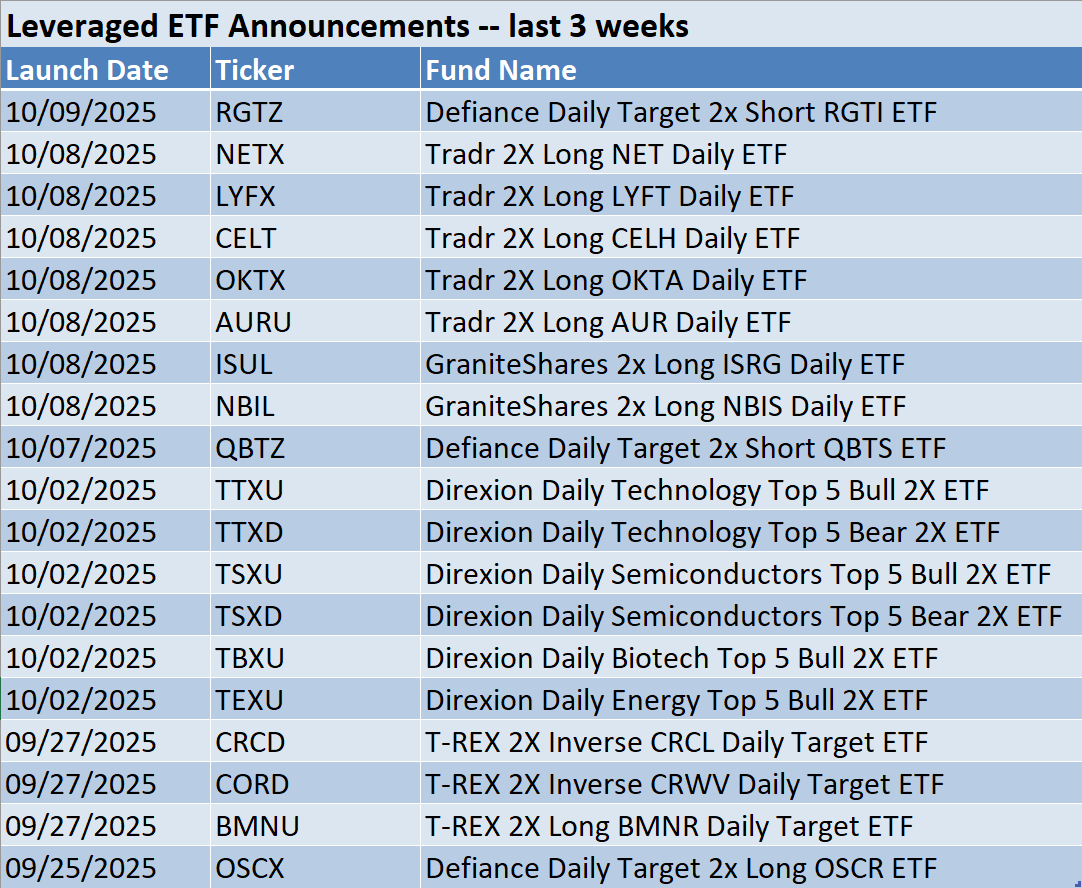 Like most of our readers, my email address has been sold by numerous people so I receive all kinds of announcements about new "products" in our industry. The last few weeks it seemed like I was getting several emails a day about new ETFs launching. Most of them seemed to have leverage on them. I don't know if this is a lost, but look at the new ETFs coming to market the last few weeks: