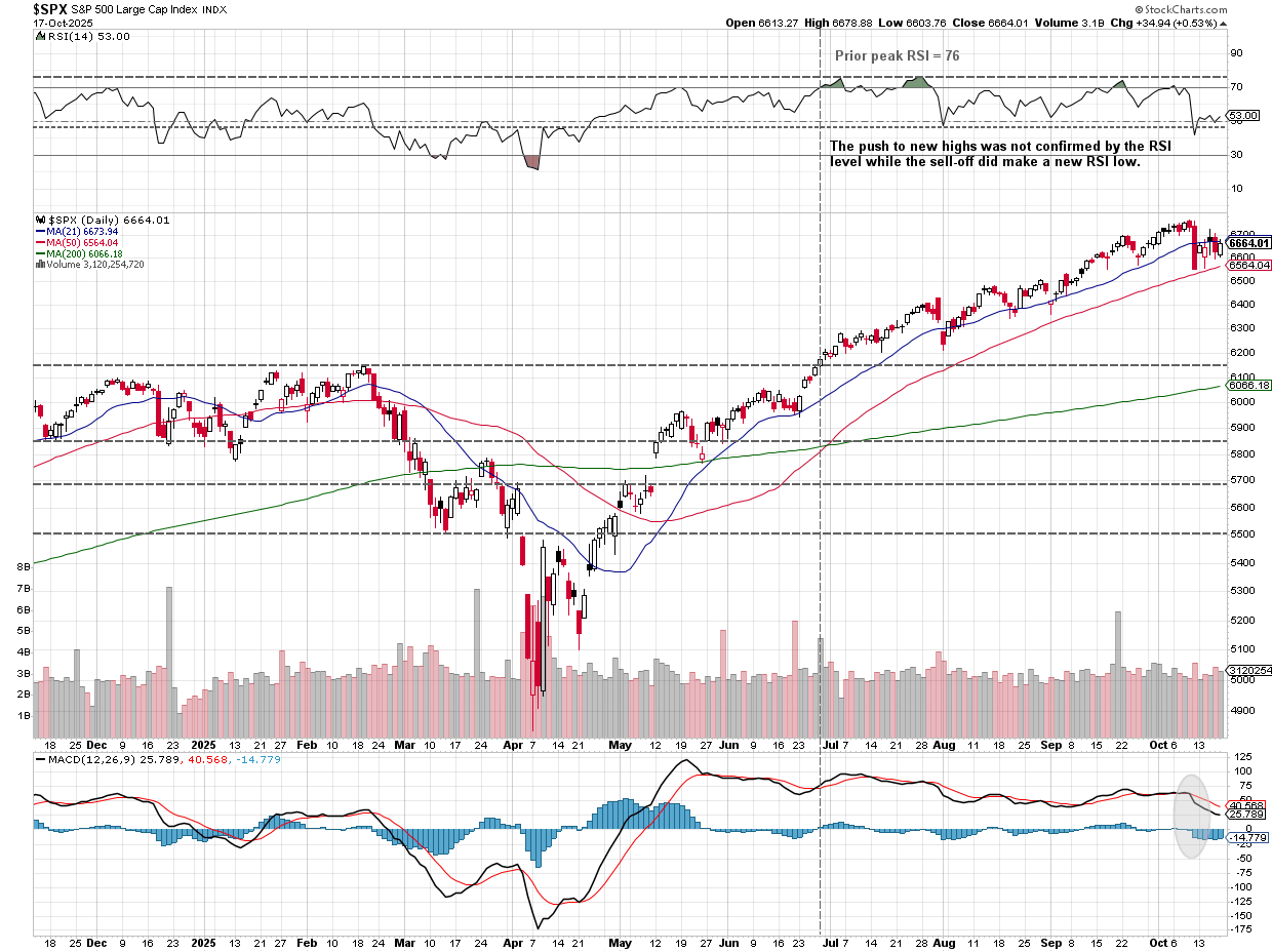 The trend remains up, shown here with the 50 day moving average being the trendline. As noted last week, the RSI (momentum indicator) did give a non-confirmation on the push to new highs while hitting a recent low on the sell-off last week, so not is all well with the trend.