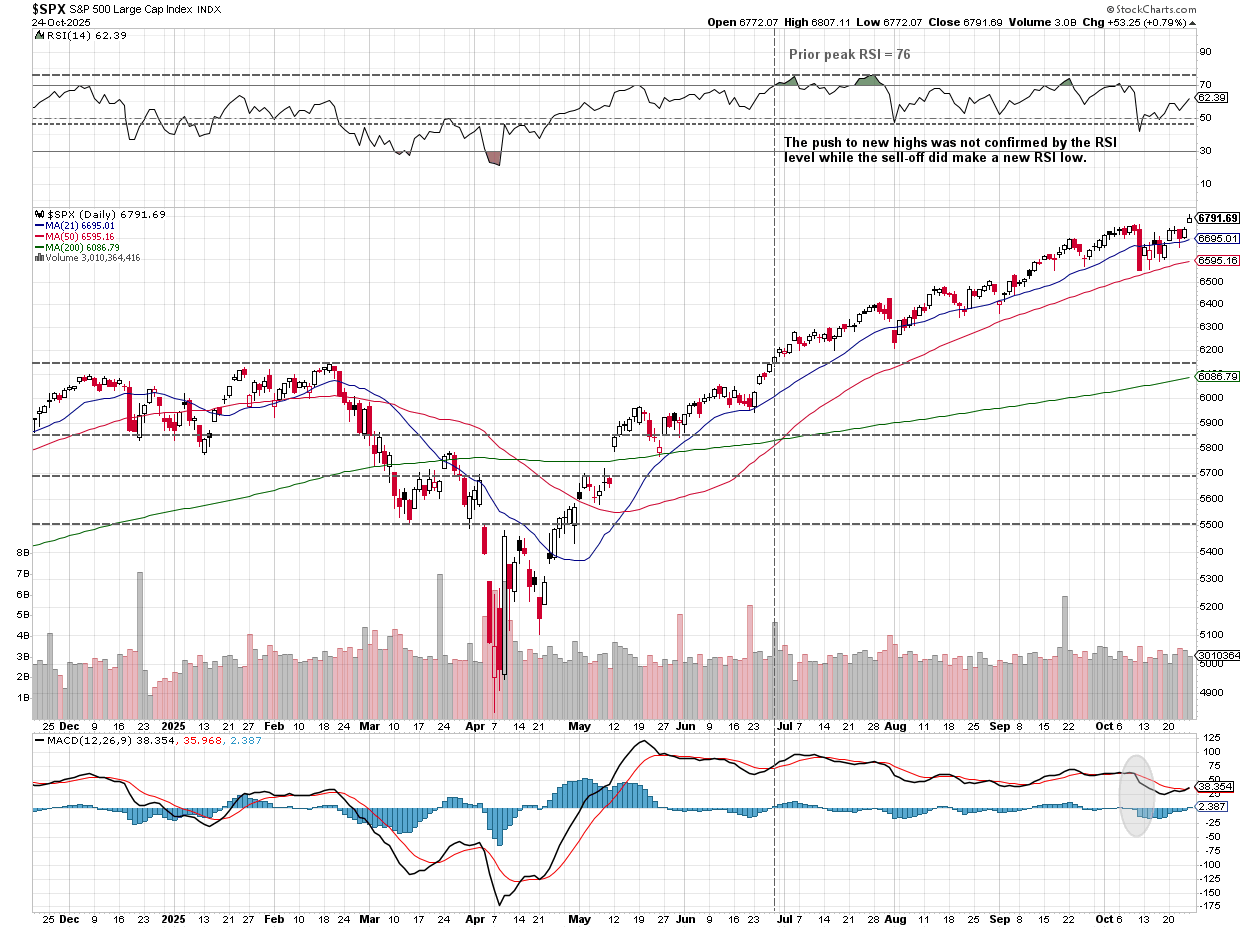 From a longer-term perspective, the uptrend remains in place, but we still have the lingering "non-confirmation" of the RSI index hanging over the market.