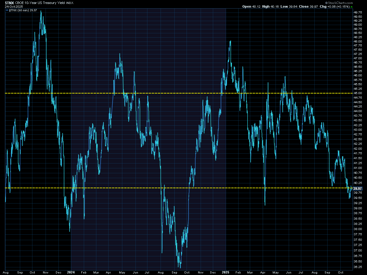 With bonds back to the bottom of the 4% band, it will be telling to see how the long-term bond market reacts to the Fed's decision this week.