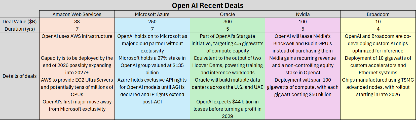 What I don't like is the shift from equity to debt financing discussed the last couple of weeks in the blog. What I really don't like is the way every company is "selling" their services to Open AI, seeing their stock prices take significant jumps, without ever asking, "how are they going to pay us?"