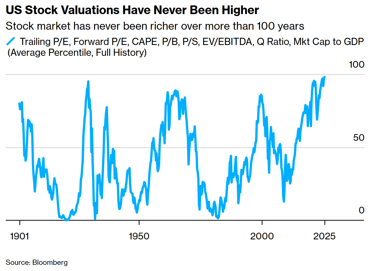 I've heard many people argue, "the P/E isn't close to what we saw in 1999, so we aren't in a bubble." The measurement above is a combination of many valuation metrics. The "E" in the P/E ratio could be artificially inflated right now, something Michael Burry (of The Big Short) fame has been arguing. Not to get into the boring accounting details, but one (such as Mr. Burry) can argue the depreciation schedules used for the AI "investments" do not account for how quickly those investments become obsolete. Some Nvidia chips are only useful for a data center for 9-15 months. Instead of being depreciated over 5 years, one could argue that should be a current year EXPENSE (thus hurting earnings).