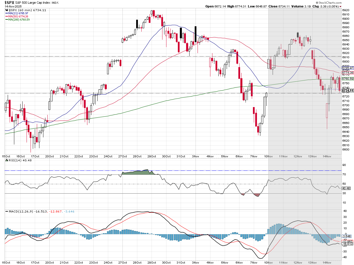 Looking at the above table, it seems like a nice, quite week. But the hourly chart tells a different story. Stocks moved higher to start the week as Congress moved to finally end the record setting shutdown. That ended shortly after the President signed the new CR.
