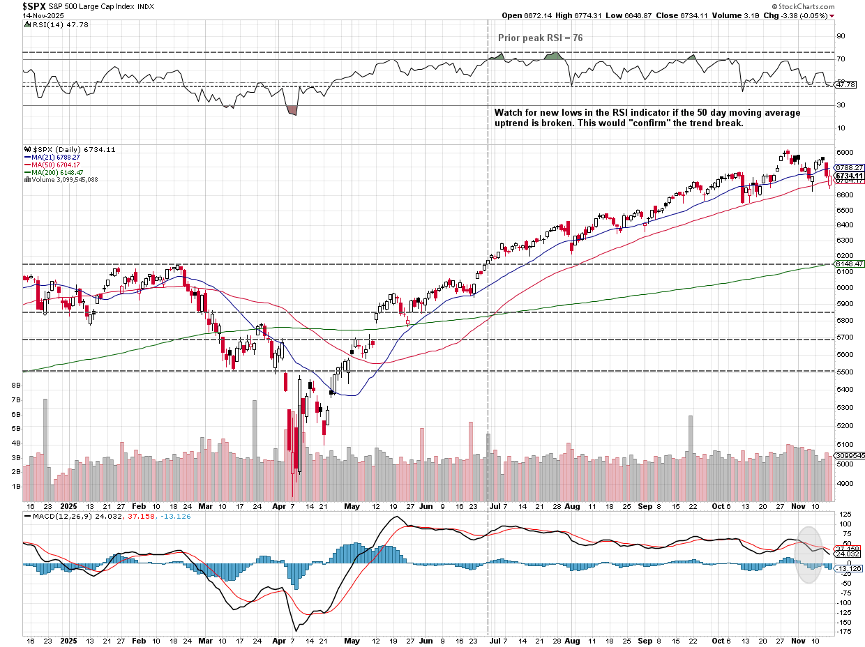 The S&P 500 ended the week again threatening to break "support". Watch the RSI for confirmation of the breakdown which could bring out plenty of profit taking.