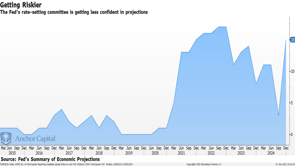 Speaking of the Fed, one of our fund partners, Anchor Capital's Chart of the Week highlighted the Fed's own internal uncertainty for their economic outlook in this chart. It plots the 'risk' they are assigning to their own forecasts being "wrong". If members of the Fed are not clear on the outlook, should we really be banking on them getting it "right" with their own policies? As we highlighted in our January Economic Update, there is probably too much focus on the Fed making things "easy" for stocks, when that isn't their job.