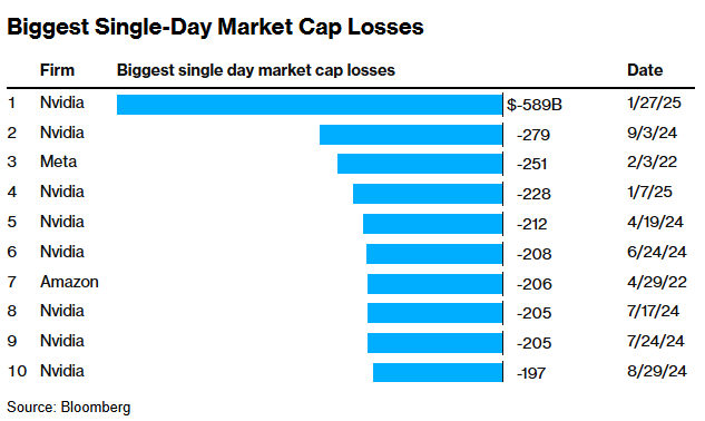 Nvidia is no stranger to record market cap drops. They now hold 8 of the top 10 biggest drops in US history: