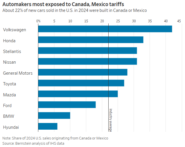 This will hurt the US automotive sector more than any other given how much of their materials are manufactured in Canada and Mexico. The Wall Street Journal discussed this in an article on Friday. 22% of all cars sold in the US were built in Canada or Mexico. GM, which is thought to be an American car manufacturer produced over 25% of their cars sold in the US in Mexico or Canada. Half of their top selling Silverado and GMC Sierra trucks were made in Canada or Mexico.