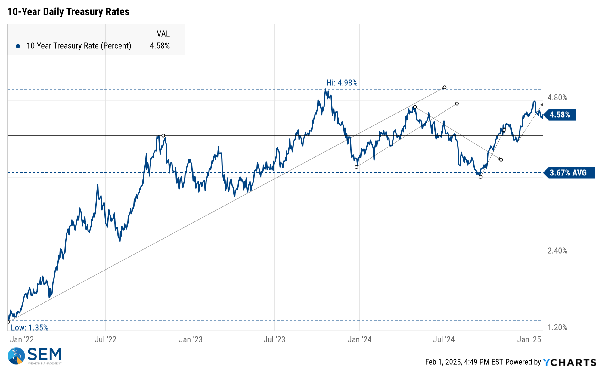 While the President likes to take credit for the stock market rally, this chart serves as a reminder that the rally started in the fall of 2023 when the Fed hinted they were not only done raising rates, but would be lowering them aggressively in 2024. That uptrend is still in place.