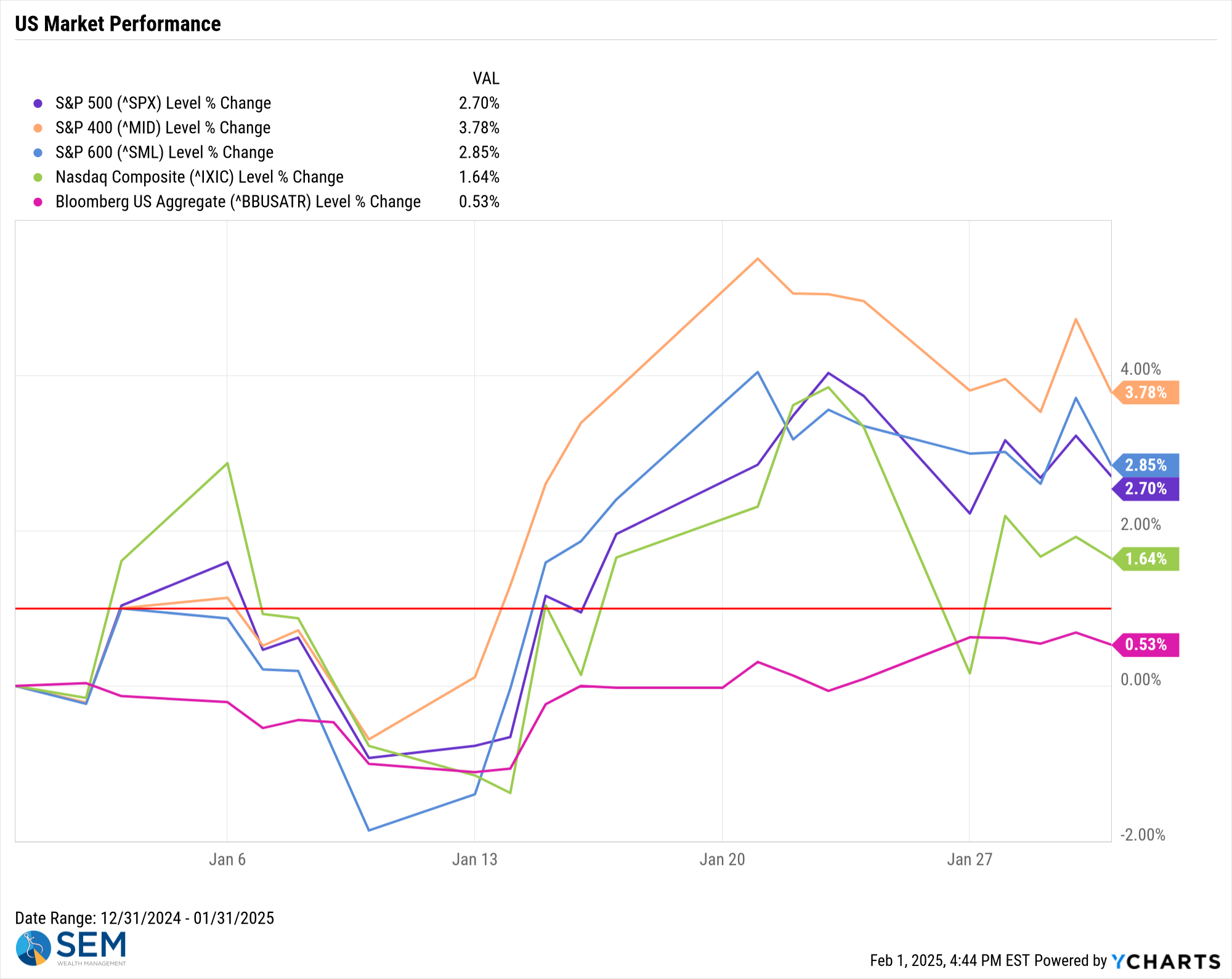 After hitting all-time highs in the first week of Trump 2.0, the AI driven sell-off started the week off on a negative note. Stocks had nearly recovered all of the losses by Friday, until the President reiterated the start of the 25% / 10% tariffs on Canada/Mexico and China respectively.