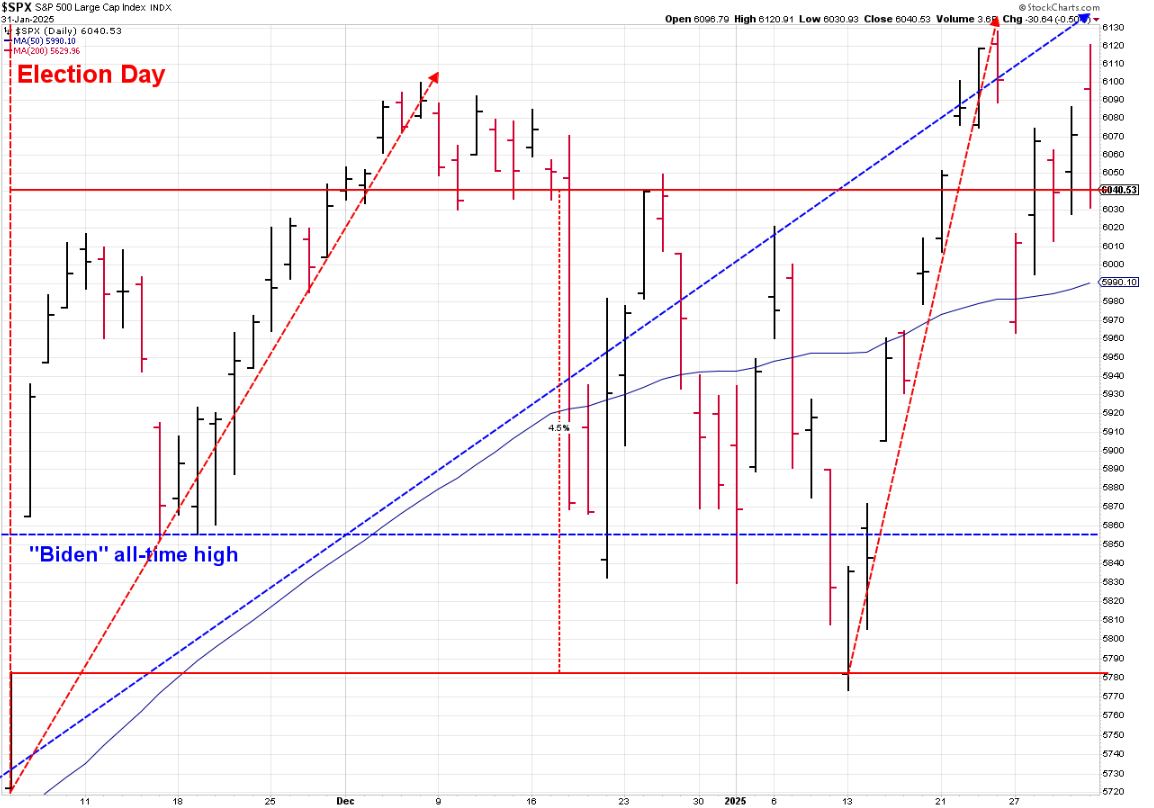 I will again remind everyone that while the start-to-finish overall returns were above average during the first Trump presidency, it was not smooth sailing. In his first term the first year was focused on tax cuts and regulatory changes. That gave the market a huge boost, but as soon as the tax cuts were done, Trump shifted to his Trade War (mostly) with China. 2018 was a very tough year for stocks.