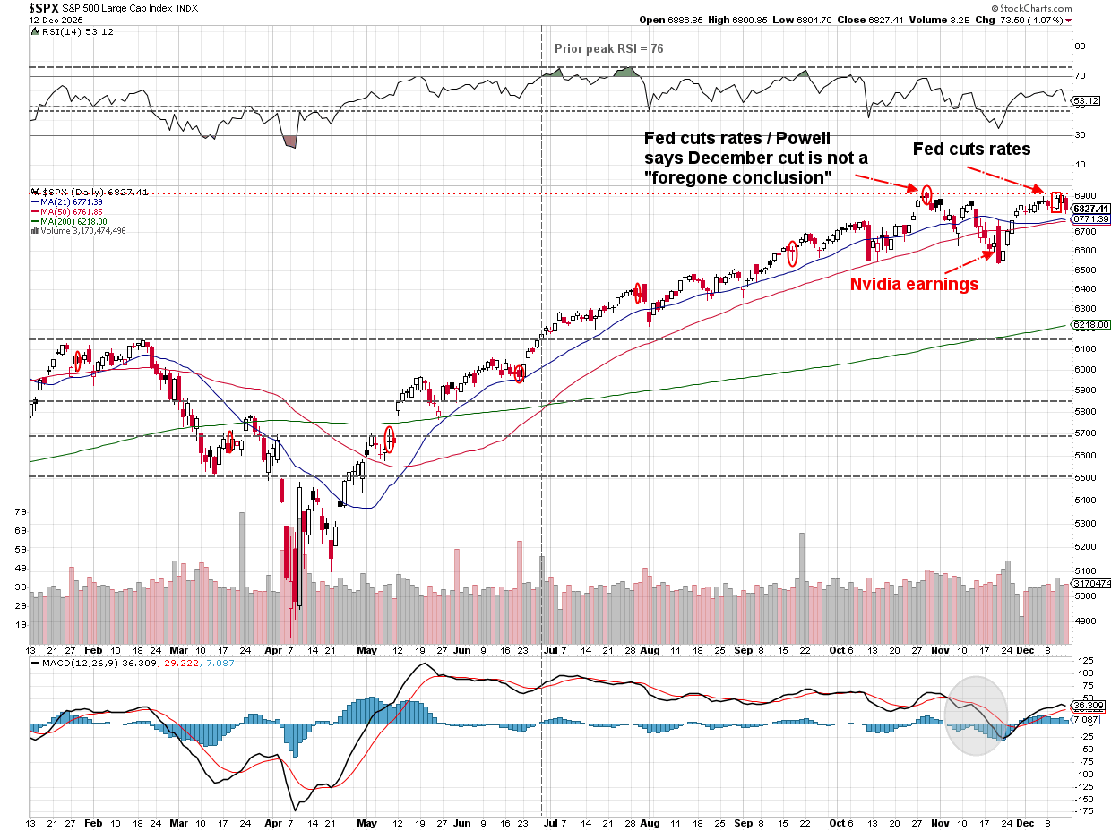 Ironically (or not) the S&P 500 got within a few points of the same level it was at the day of the last Fed meeting – the one when Chair Powell said a December cut was not a "foregone" conclusion.