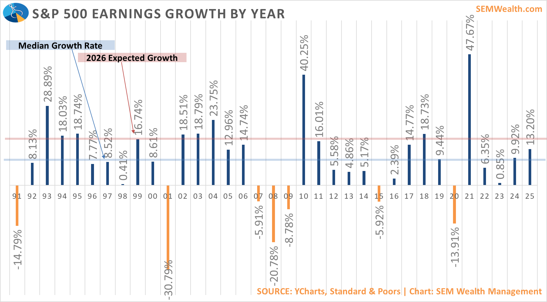 During our year-end update and outlook webinar, I included this chart which shows the calendar year earnings growth for the S&P 500. My point was to show how unprecedented the current 17% earnings growth would be by itself, but also to highlight the few other times we've seen this type of consecutively strong years (93-95, 02-06, & 17-18). It doesn't mean it cannot happen, but it is a high bar.