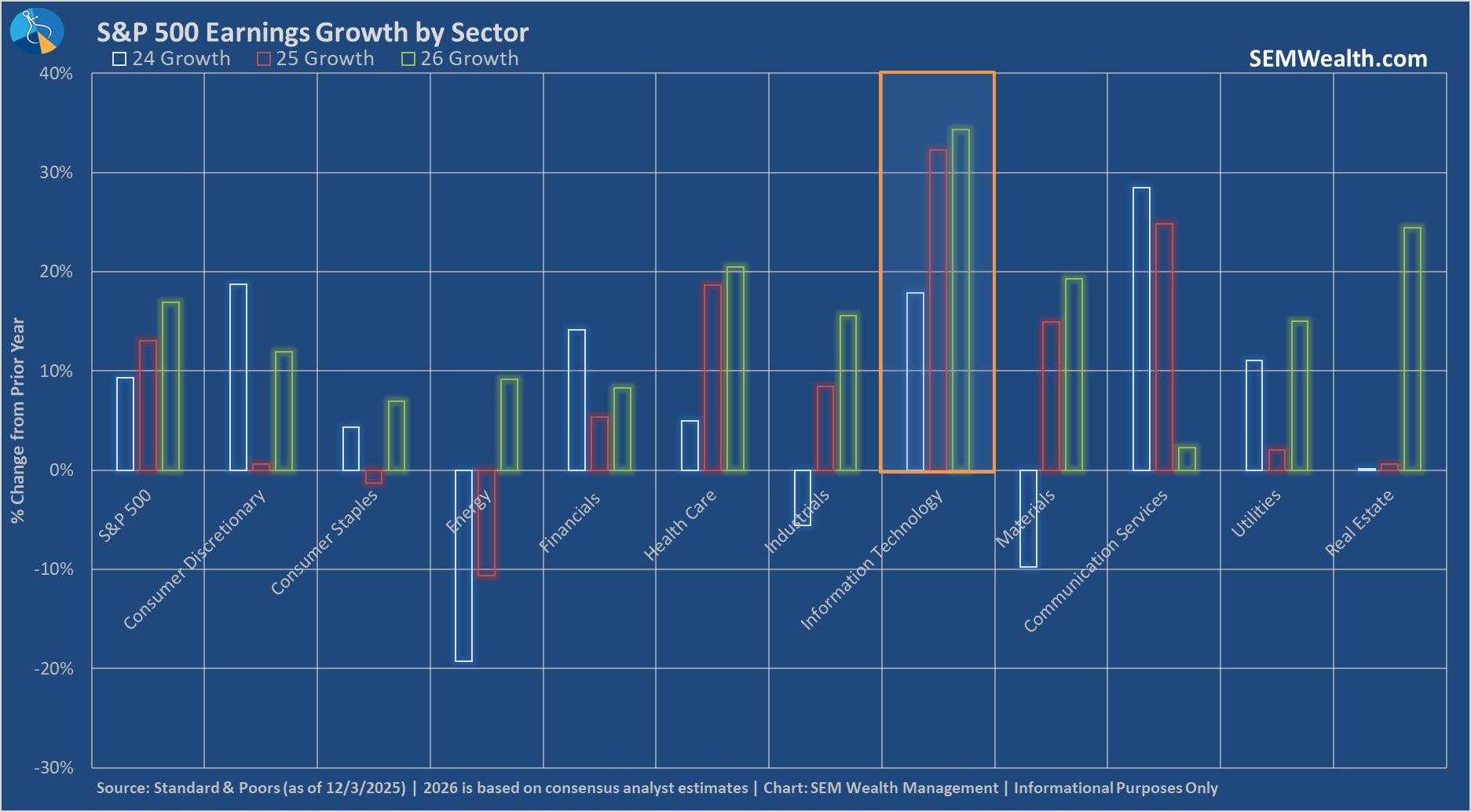 Not only are analysts not expecting a "broadening" in earnings, they are expecting earnings growth for technology companies to be even stronger in 2026, increasing by 34% (up from 32% in 2025 & 18% in 2024).