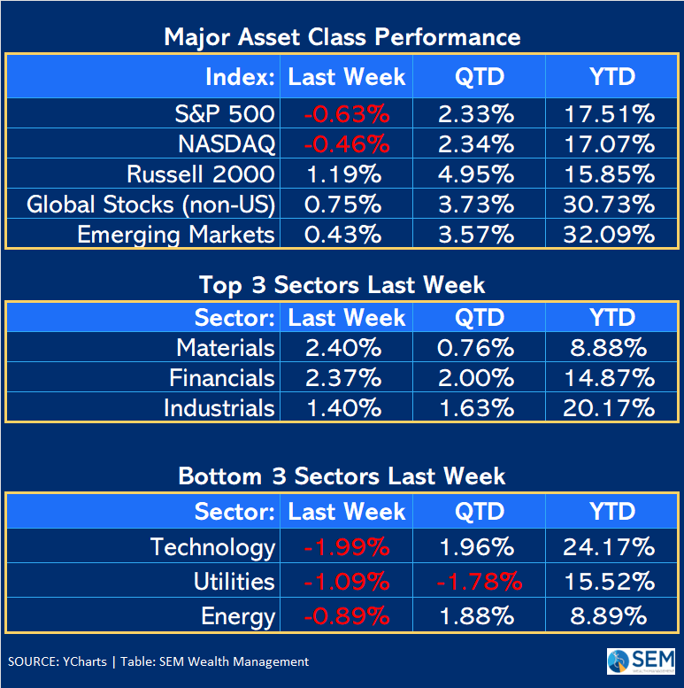A rebalance is prudent. SEM rebalances our portfolios across all clients at least once a year (we strive for 12-months + 1 day or more to capture long-term gains). It's not a wholesale change, but it is a chance to take the winners off the table and redeploy to those assets which have underperformed.