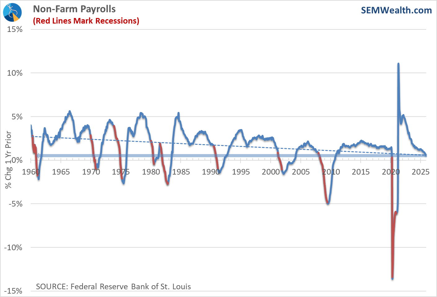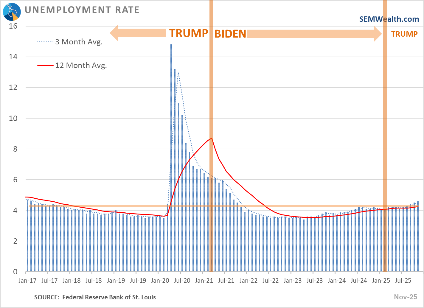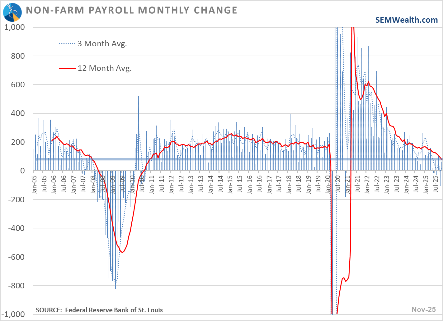 The Payrolls report for October and November confirmed what we learned from the ADP and other private sector data that we received during the government shutdown – the labor market is most certainly slowing. The monthly chart illustrates the continued decline in the number of new jobs, which has been falling at a steady rate since early 2024.