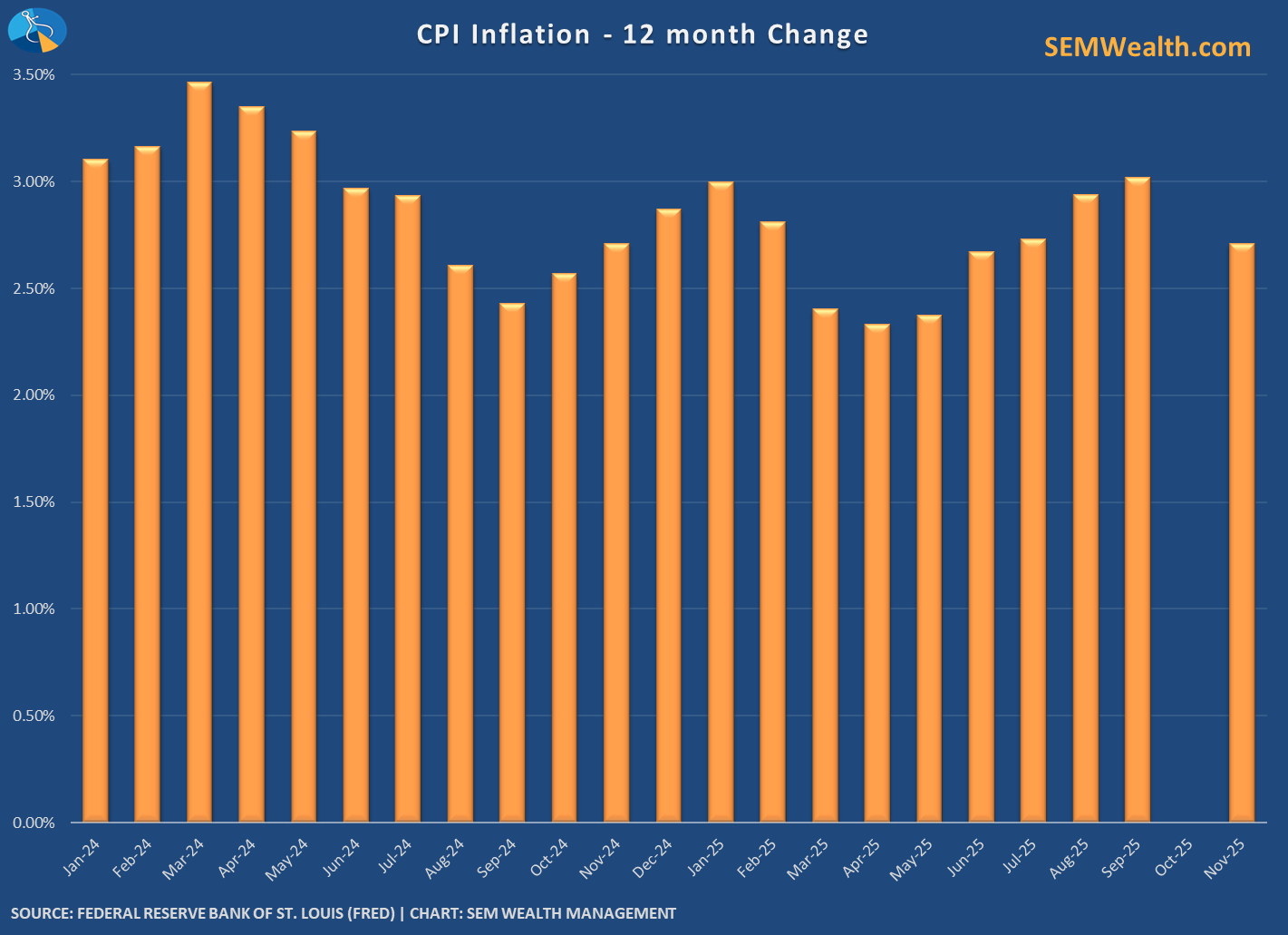 We've also seen some growing concern about the independence of both the Federal Reserve and the departments supplying the data. When President Trump fired the head of the Bureau of Labor Statistics (BLS) earlier this year due following a weak payroll report, some questioned whether we could trust the data coming out of the BLS. This is important as the BLS provides both the monthly payrolls report as well as the consumer and producer inflation reports (CPI & PPI). Not much was said about this until this week when the BLS released an inflation report that surprised even the most optimistic economists. CPI had been trending up before the government shutdown. During the shutdown the government wasn't collecting data. The BLS decided to both skip any sort of October data as well as use "statistical adjustments" for the November data. Those adjustments did not make much sense to most observers, including New York Fed President John Williams.