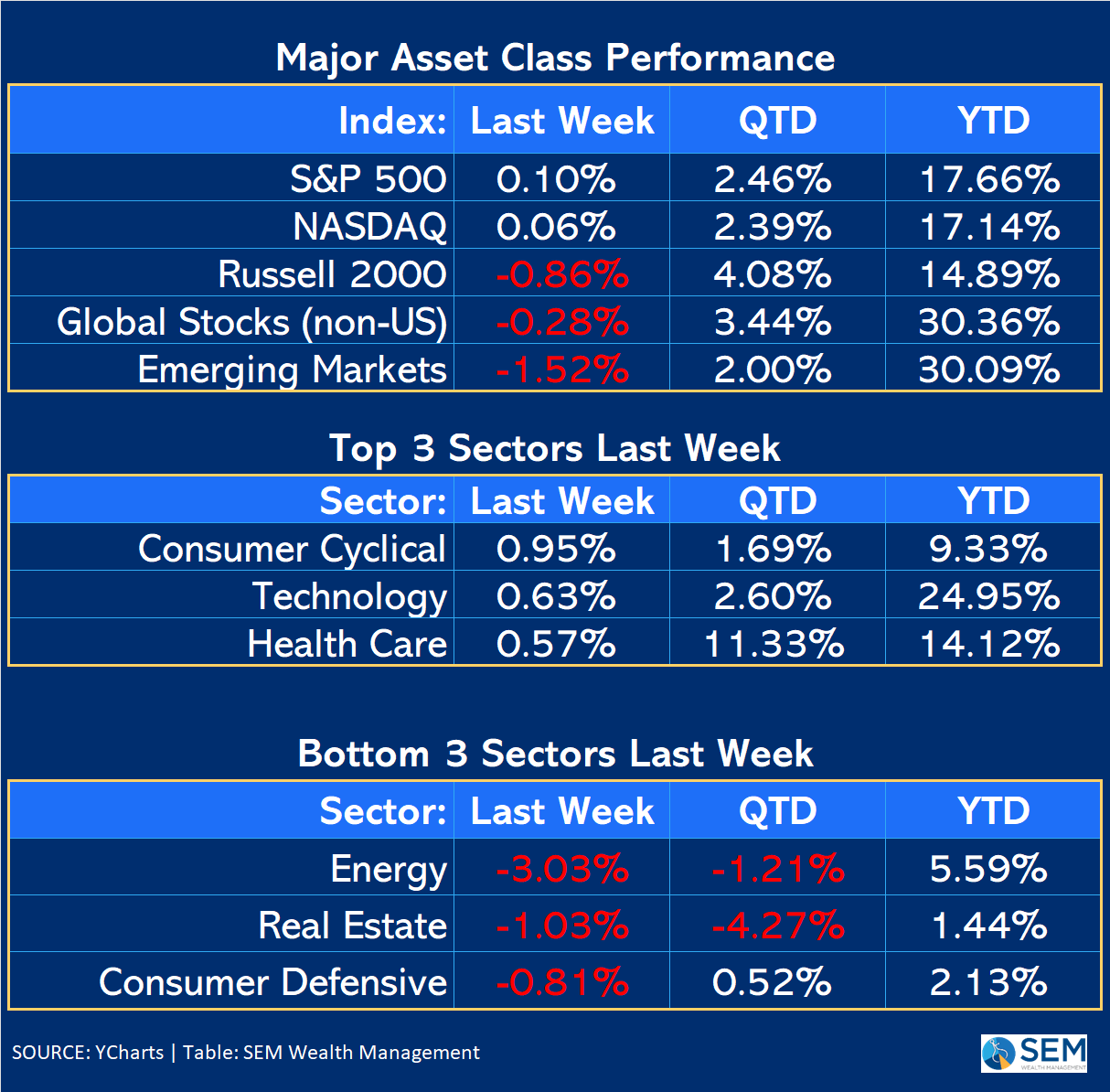 The market again shifted last week to "growth" mode, with the defensive sectors getting hit once again. The first 3 days were down and the last 2 were up just enough to give us a "flat" week for the S&P 500. Small caps (again) fell.
