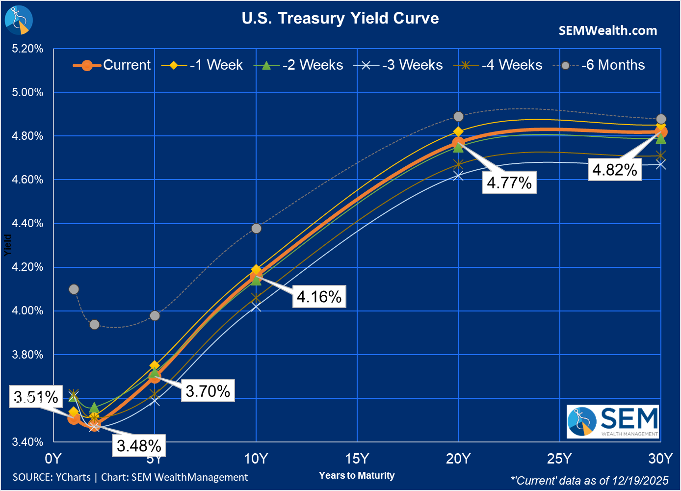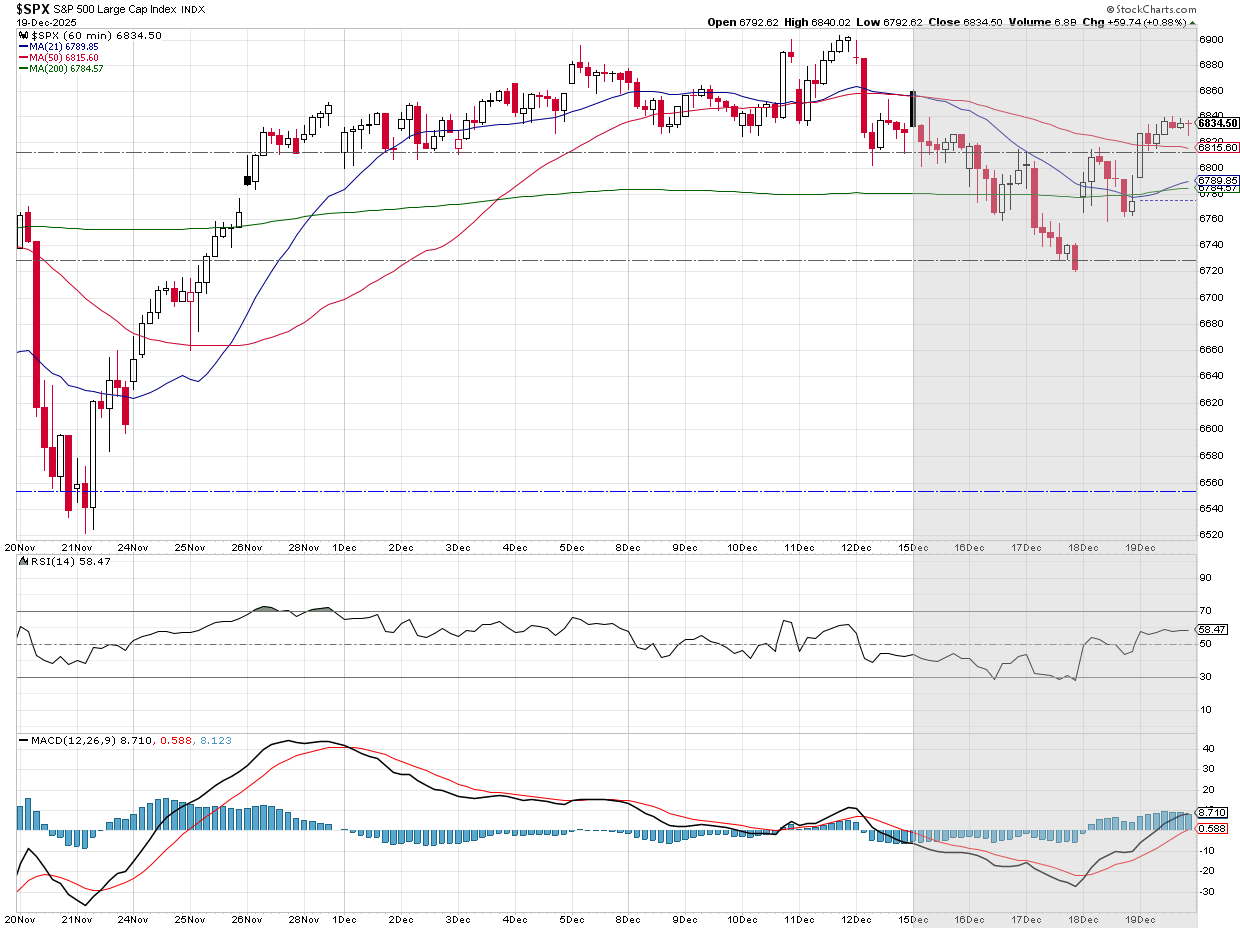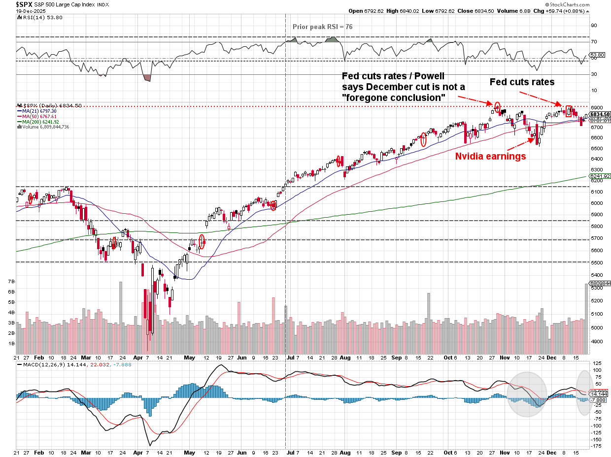 The stock market did celebrate Thursday's release of CPI data for November, which showed the 12-month inflation rate falling to 2.7% from September's 3.0%. Economists questioned the data, including New York Fed Governor (and the latest "finalist" to be tossed into the 'favorite' category to be named the next Fed Chair), John Williams said the data is missing some key weeks and probably is not showing the whole picture. Mr. Williams indicated this is one reason why the Fed went "slow" with just a 25 bp cut in December.