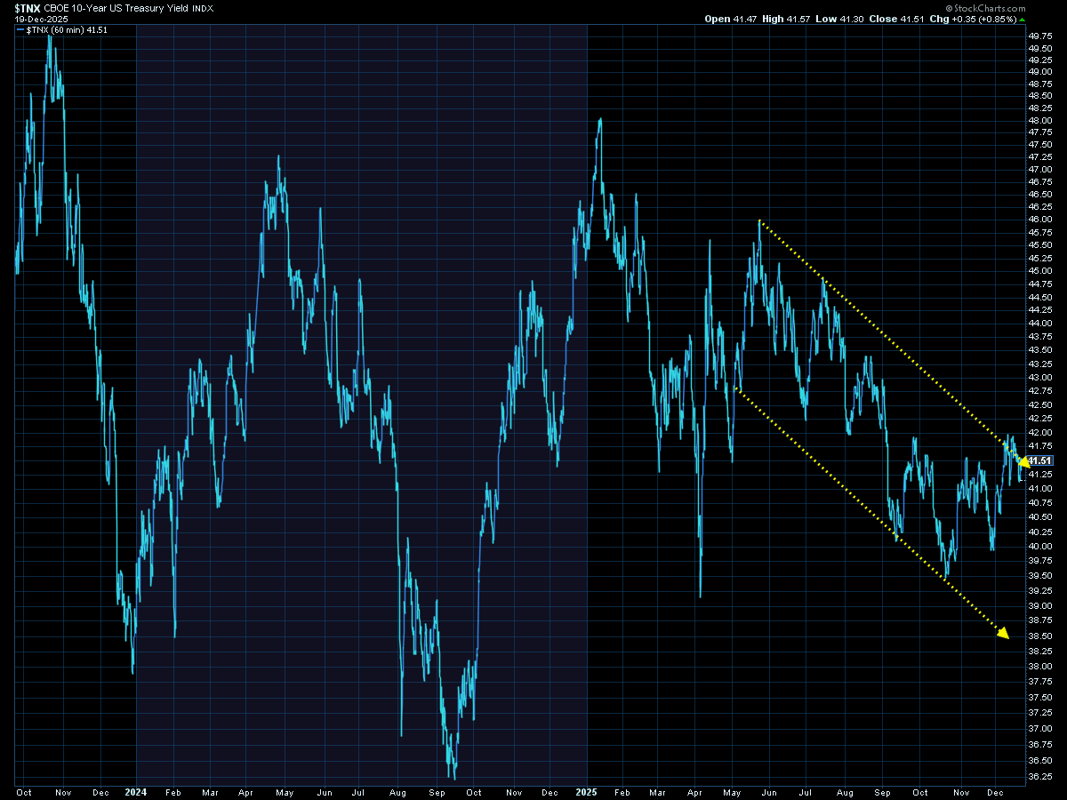 The 10-year did fall back into our downtrend channel, which is good news (for now.)
