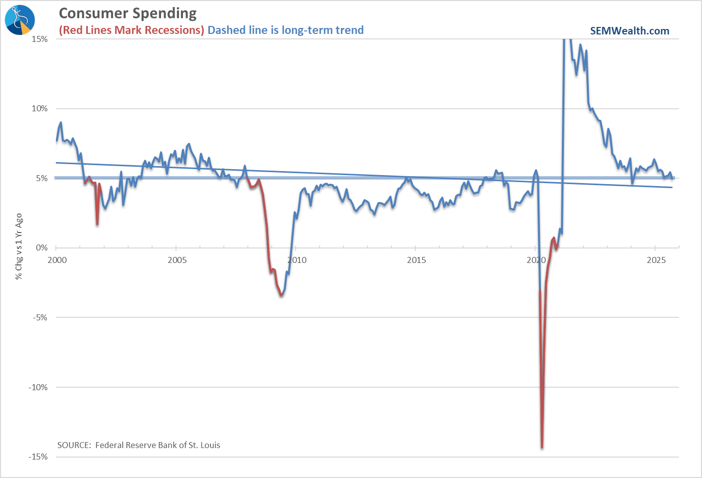 Those 4 categories accounted for 84% of the growth in the 3rd quarter. The rest of the growth was attributed to Consumer Spending. While still positive, the year-over-year growth rate continues to decelerate. It remains a still strong 5% (through September). The chart below puts this in perspective – consumer spending growth was a spectacular driver in the post-pandemic recovery and shifted to levels not seen this century. Since then, the "K-shaped" economy and the fact we only need so much "stuff" has pulled spending growth down a bit to more reasonable levels.