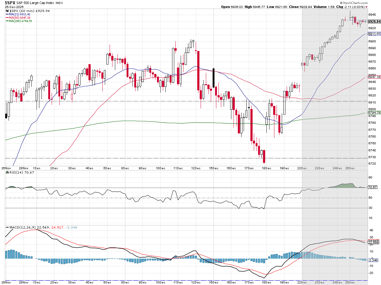 The S&P was able to move to a new record closing high on Friday. This is the same level it hit following the last 2 Fed meetings. From a technical perspective we don't have any "negative" divergences (yet), but there likewise aren't any "positive" technical developments. It's best on these holiday weeks to just let the market do its thing without taking it too seriously in either direction. Volume is light and investors are trying to position their portfolios for the year ahead.