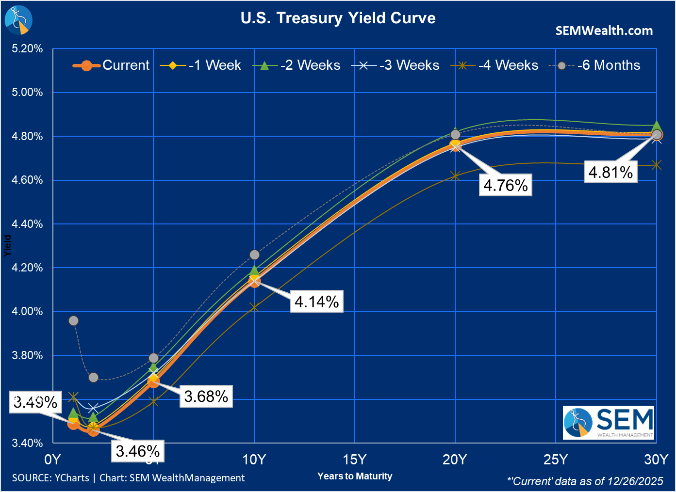 The yield curve was unchanged for the week. Rates are slightly lower than they were 6 months ago, but higher than they were a month ago.