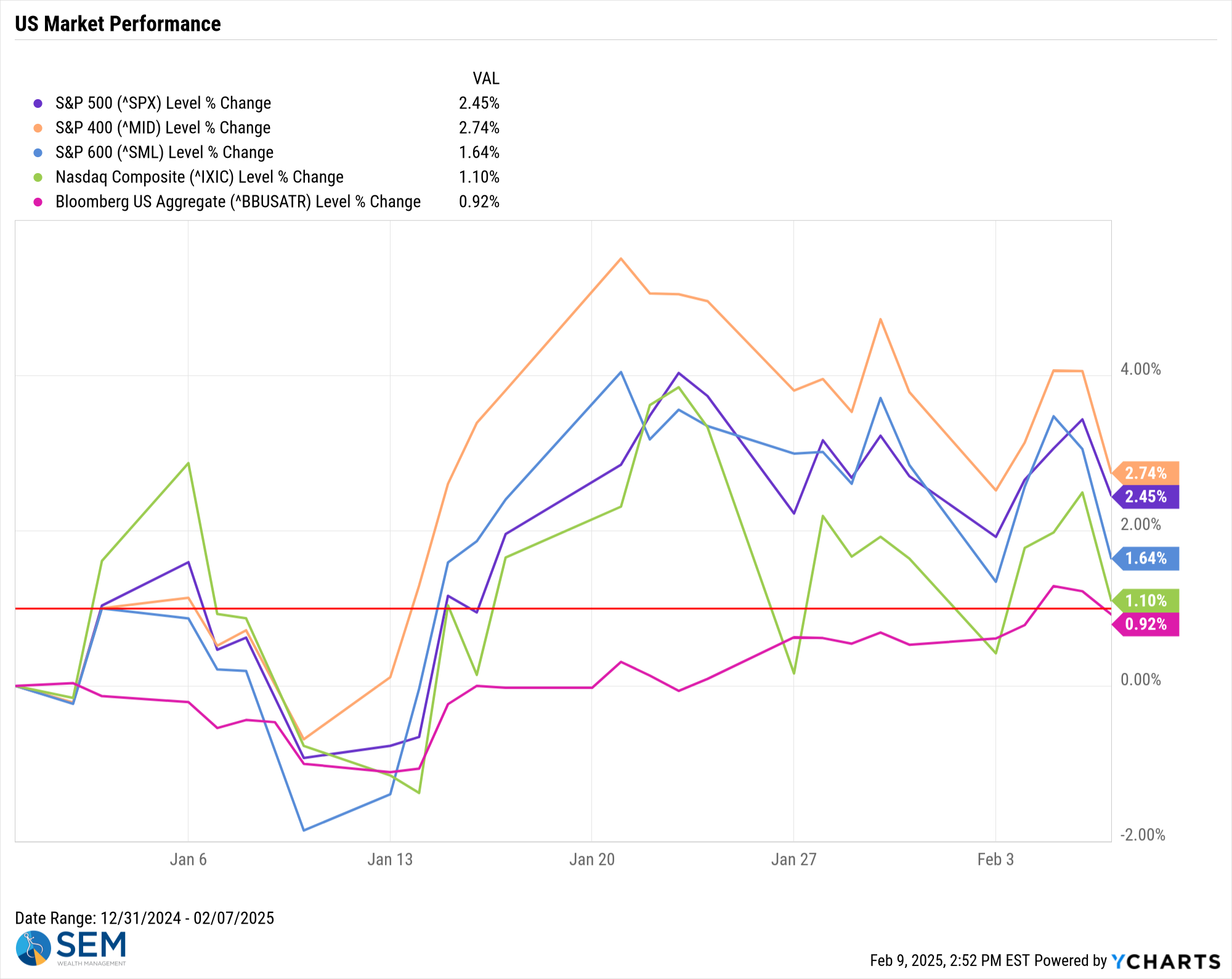 We started the week last week with a big sell off in stocks after President Trump followed through with his threat of tariffs on Canada, Mexico, and China over fentanyl, illegal immigration, and trade deficits. Whether these were simply bargaining chips to force Canada & Mexico's hand or not, Trump quickly issued a 30-day moratorium after both countries committed more troops to the border. I'll leave the commentary there as I don't believe anybody can successfully predict what the President will or will not do over the coming months and what his definition will be in determining whether either country is doing "enough".